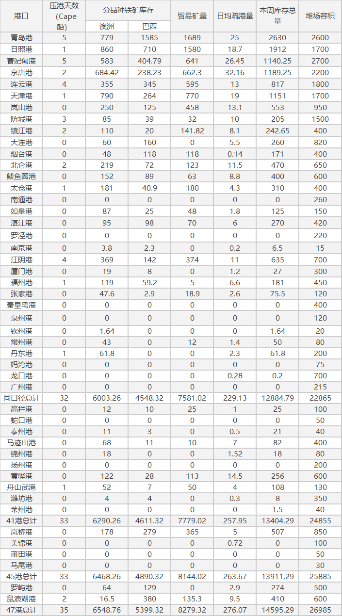 全国45个港口进口铁矿库存为13911.29万吨 环比增185.46万吨