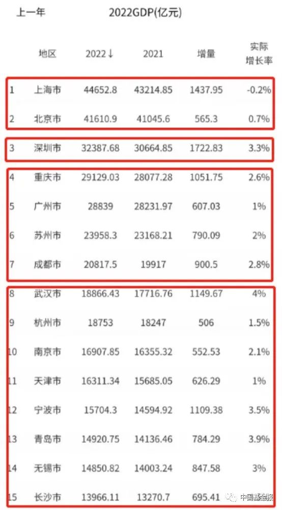 | 随着各地统计公报密集发布,2022年中国内地城市GDP数据及排名基本尘埃落定。 整体来看,受多重超预期因素影响,2022年万亿GDP城市没有新增,仍维持24座,区域格局上“东强西弱、南强北弱”趋势明显,其中粤苏两省依然各以4座万亿城市并驾齐驱走在前列,占到总数的三分之一。 但在内外环境深刻变化之下,这些万亿大城内部却迎来大洗牌。前十强来看,最为公众关注的是广州GDP被重庆超过,丢掉国内第四城位置。另外,2020年因疫情重创被杭州超过的武汉,经过两年追赶重回国内城市第八位。11到20名来看,全国省域GDP增速第一的福建,出现福州和泉州两匹黑马,整体超越山东省会济南和安徽省会合肥。 从各地公布的2023年目标增速来看,广州能否重回第四值得关注,而常州、烟台两市明确表示要在2023年冲击“万亿GDP之城”。 “万亿俱乐部”仍为24城 东强西弱、南强北弱、粤苏争霸 对于一个城市的发展来说,GDP不仅是重要宏观经济指标之一,也是城市竞争力和活力的重要体现。因此,尽管目前早已“不唯GDP”,但冲击GDP“万亿俱乐部”仍是很多城市的发展目标。 1月20日和28日,常州市和烟台市统计局相继发布了2022年国民经济运行情况,GDP分别录得9550.1亿和9515.86亿元。这意味着,2022年没有新增GDP突破万亿的城市。“万亿俱乐部”成员仍只有24城,分别为上海、北京、深圳、广州、重庆、天津、苏州、武汉、成都、杭州、南京、青岛、无锡、长沙、宁波、郑州、佛山、福州、泉州、南通、合肥、西安、济南、东莞。 从这24城2022年GDP绝对值来看,形成了几个梯队,上海(44652.8亿元)、北京(41610.9亿元)两个直辖市超过4万亿,形成第一梯队;深圳以32387.68亿元继续独占3万亿区间,形成第二梯队;2万亿梯队城市则有四个,重庆(29129.03亿元)和广州(28839亿元)接近3万亿,紧随其后的是苏州(23958.3亿元)及刚刚突破2万亿的成都(20817.5亿元);剩下17个城市GDP则处在1万亿到2万亿区间,构成最庞大的第四梯队。 ![]() 从这些万亿之城的地理分布来看,“东强西弱、南强北弱”的格局明显。 24城里中部和西部城市只有7座,其中中部地区是四座强省会城市——郑州、合肥、武汉和长沙,西部地区则是西南重镇重庆和成都,外加西北中心城市西安,其余17座城市均来自东部沿海地区。而以“秦岭-淮河”地理分界线来看,则是南方城市遥遥领先,18座城市位于南方,只有6座位于北方。这6座北方城市分别是北京、天津、郑州、济南、青岛和西安。 广东和江苏作为国内GDP第一和第二大省,万亿城市数量最多,各有四席,占总数量的三分之一,远超两省GDP在全国GDP中的占比。其中广东有深圳、广州两个一线城市,以及佛山、东莞两座工业强市,江苏则有“中国最强地级市”苏州、省城南京及苏南重镇无锡和南通。 粤苏之外,浙江、山东、福建三省均有2座万亿GDP城市,分别是杭州和宁波、济南和青岛、福州和泉州。 重庆超广州,武汉重回第八 福建两城携手弯道超车 虽然2022年万亿大城没有新增,但内部的洗牌和分化却异常剧烈。 最吸引眼球的是中国经济第四城广州在前两年被“省内兄弟”深圳超过后,2022年又被重庆甩在了身后。 1月20日,四季度遭遇疫情重创的广州,公布了2022年最终GDP数据——28839亿元,同比增长只有1%。这一数字相较前一日重庆市披露的29129.03亿元(同比增速2.6%)差了290.03亿元。重庆的经济总量时隔近四十年后再次超越广州。 ![]() 不过,重庆到底是一个省还是一个市也存在一定争议,如果单以主城都市区来看,重庆主城GDP总量刚过2.1万亿元,只与成都基本相当,远低于广州和深圳,甚至低于苏州。 2023年来看,在全面拼经济的背景下,只要增速追回1个百分点,广州就有望重回第四。中国基金报记者注意到,两城的2023政府工作报告都设定了“6%以上”的增速,但广州各区普遍将增速目标定在6.5%乃至7%,未来反超重庆仍存较大可能。 前十强来看,还有武汉反超杭州,重新夺回第八位置。 2月1日,武汉市统计局、国家统计局武汉调查队联合发布,2022年武汉市地区生产总值(GDP)18866.43亿元,比上年增长4%,比此前杭州的数据(18753亿元)高出110多亿元。 之所以说是“重新夺回”,是因为2020年受大规模疫情冲击,武汉整个城市按下暂停键,GDP出现了改革开放以来首次负增长,经济总量无奈被杭州赶超。如今用了整整两年时间,两城又回到了原来的座次。 11到20名城市的主要看点,则是福建省的福州和泉州“弯道超车”,携手完成了对多个省会城市的整体超越。 2022年福建省生产总值53109.85亿元,比上年增长4.7%,与江西省一道,并列成为全国省域增速第一。而福州市2022年实现地区生产总值12308.23亿元,增长4.4%,泉州则实现12102.97亿元,增长3.5%,GDP总量分别排在全国城市的18位和19位,超越山东省会济南(12027亿元)和安徽省会合肥。 目前,前二十城市中郑州和合肥增速还未最终公布,郑州因为后无追兵仍能保持位置,但济南和合肥谁将最终被挤出20强仍有悬念。 21到24位城市的争夺同样激烈,南通、东莞2022年GDP被西安反超,但差距都只在百亿元左右,相比过万亿的GDP总量,未来只需一两个百分点的增速差,这几个城市又将重新易位。 常州烟台明确2023年冲击万亿 东北诞生万亿之城或仍需三年 随着疫情因素散去,2023年各地开始发力拼经济,哪些城市有希望冲击万亿? 最有可能的就是2022年“惜败”的苏南重镇常州及山东第三城烟台。常州、烟