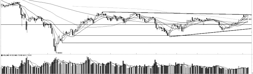 上周IF加权在触及上升通道上沿的压力位后回落,目前该上升通道保持良好。均线方面,MA5开始拐头向下,但MA10、MA20与MA60依然向上,MA20有望成为重要的移动压力线。指标方面,MACD红柱持续收窄,但DIF与DEA仍在0轴之上,表明IF加权短期有调整压力,但上涨动力依然存在。整体看,IF加权重心上移的趋势尚未改变,后市重点关注通道下轨的支撑情况,同时该位置也是重要的做多买点。 IC 测试压力