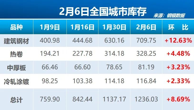 | 本周城市总库存量为1236.03万吨,较上周环比增加98.86万吨(+8.69%)包含40个城市,共计142个仓库。 ①本周建筑钢材库存总量为709.75万吨,较上周环比增加79.59万吨(+12.63%),包含31个城市,共计84个仓库; ②本周热卷库存总量为328.25万吨,较上周环比增加14.07万吨(+4.48%),包含17个城市,共计49个仓库; ③本周中厚板库存总量为81.19万吨,较上周环比增加2.54万吨(+3.23%),包含9个城市,共计17个仓库; ④本周冷轧涂镀库存总量为116.84万吨,较上周环比增加2.66万吨(+2.33%),包含6个城市,共计15个仓库。 ![]() (文章来源:新华财经) (责任编辑:admin) |