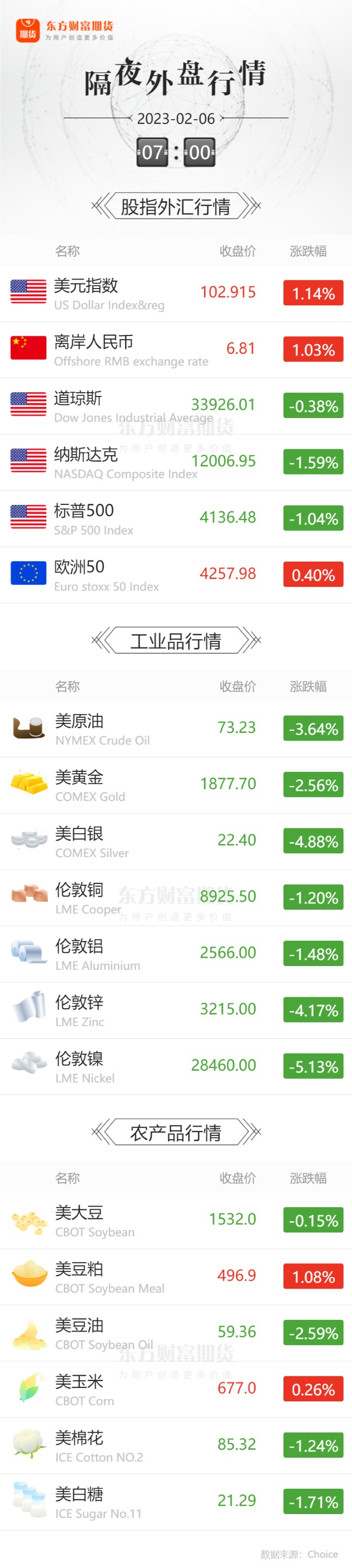 外盘收报![]() 每日精选李克强主持召开国务院全体会议讨论《政府工作报告(征求意见稿)》 降息预期消退大半!本周鲍威尔没能做成的事 非农做成了 终于官宣了!G7和欧盟正式敲定对俄罗斯柴油价格上限:100美元 宏观产经央视网:国务院总理李克强3日主持召开国务院第八次全体会议,讨论拟提请十四届全国人大一次会议审议的政府工作报告,决定将《政府工作报告(征求意见稿)》发往各省(区、市)和中央国家机关有关部门、单位征求意见。李克强说,随着稳经济一揽子政策措施持续发挥效应和优化调整疫情防控措施的落实,当前经济运行正在回升。各部门要贯彻党中央、国务院部署,继续抓好当前经济社会发展工作,巩固和拓展经济运行回升态势。韩正、孙春兰、胡春华、刘鹤和魏凤和、王勇、王毅、肖捷、赵克志等出席。 外交部:2023年2月3日晚,中共中央政治局委员、中央外事工作委员会办公室主任王毅应约同美国国务卿布林肯通电话。双方就如何以冷静、专业态度处理偶发事件进行了沟通。王毅强调,中国是负责任国家,一贯严格遵守国际法,我们不接受任何无端的臆测和炒作。面对意外情况,双方要做的,就是保持定力,及时沟通,避免误判,管控分歧。 央行:2022年末,人民币房地产贷款余额53.16万亿元,同比增长1.5%,比上年末增速低6.5个百分点;全年增加7213亿元,占同期各项贷款增量的3.4%。 2022年末,房地产开发贷款余额12.69万亿元,同比增长3.7%,增速比三季度末高1.5个百分点,比上年末高2.8个百分点。个人住房贷款余额38.8万亿元,同比增长1.2%,增速比上年末低10个百分点。 界面新闻:国家发改委公告,自3日24时起,国内汽油价格上调210元/吨,柴油价格上调200元/吨。折合升价,92号汽油价格上调0.16元/升,95号汽油、0号柴油均上调0.17元/升。私家车主和物流企业的用油成本因此增加。以油箱容量50L的普通私家车计算,车主们加满一箱油将多花8元左右;对满载50吨的大型物流运输车辆而言,平均每行驶一百公里,燃油费用增加6.8元左右。 界面新闻:郑州首套房贷利率正式由4.1%调整为3.8%引起了市场的普遍关注,事实上,不止郑州,在春节前后,已经有多地发布了下调首套房贷利率下限的通知。30个城市房贷利率均低于4.1%的下限,同时呈现了4.0%、3.9%、3.8%和3.7%的四个梯队。 财联社:周五(2月3日)美股盘前,美国劳工部公布的就业形势报告显示,美国1月非农超预期增长,增幅是市场预期的两倍有余。具体数据显示,美国1月季调后非农就业人口增加51.7万人,显著强于市场预期的18.5万人,为2022年7月以来的最高水平,表明在美联储试图放缓经济增长之际,劳动力市场依然强劲。 大商所:大商所将紧紧围绕会党委确定的2023年工作重点,在服务实体经济高质量发展、助力宏观经济大盘稳定上持续发力。一是以产业风险管理需求和初级产品保供稳价为导向,加快产品创新,推动交割等基础制度完善。二是以场内场外协同高效服务实体经济为导向,提高市场运行质量和服务效能。三是以提升重要大宗商品价格影响力为导向,持续推进定价中心建设。四是以高水平科技自立自强支持市场发展为导向,加快数字大商所建设。五是以守牢期货市场安全稳定运行底线为导向,强化依法从严监管。 上期所:上期所召开2023年工作会议,会议明确,推动高水平对外开放。以QFII/RQFII参与商品期货市场为契机,加快推动新品种和现有品种国际化,丰富产品跨境合作。加大国际推广范围和力度,吸引全球交易者广泛参与。推动全球企业在贸易场景中更多使用和参考上期所价格。 品种资讯黑色系&有色系期货 中国证券报:最新机构监测数据显示,全国钢材社会库存连续7周上升,建材、板材库存上升速度有所放缓。从需求端看,节后下游需求释放有限,市场成交依然不足,市场需求处于恢复阶段。 铁矿石:上周,Mysteel统计全国45港进口铁矿石库存为13911.29万吨,环比增185.46万吨;日均疏港量263.67万吨增12.84万吨。47港进口铁矿石库存总量14595.29万吨,环比增159.46万吨;日均疏港量276.07万吨,环比增14.64万吨。 钢厂:据Mysteel调研了解,2月有25座高炉计划复产,涉及产能约9.4万吨/天;有5座高炉计划停检修,涉及产能约1.6万吨/天。若按照目前统计到的停复产计划生产,预计2月日均铁水产量231.5万吨/天。 上周,Mysteel调研247家钢厂高炉开工率77.41%,环比增加0.72%,同比增加2.55%;高炉炼铁产能利用率84.32%,环比增加0.18%,同比增加2.81%;钢厂盈利率34.20%,环比增加1.73%,同比下降48.92%。 上周,Mysteel统计全国钢厂进口铁矿石库存总量为9220.27万吨,环比减少8.02万吨;当前样本钢厂的进口矿日耗为278.87万吨,环比增加0.64万吨,库存消费比33.06,环比减少0.11天。 界面新闻:华菱钢铁在接受机构调研时表示,近期钢材需求的走好,带动焦煤焦炭价格小幅上涨;展望后续,在政策层面提出提高煤炭资源保供能力后,澳煤进口开始放开,供需紧张局面区域缓解,煤炭行业高价格或难持续。 上海航运交易所:下游需求提升缓慢,北方港口库存高企,堆场场地紧张,疏港压力凸显,部分港区调整库场使用费,贸易商降价出货,小船货盘稍有好转,但市场运力依旧较多,沿海煤炭运价弱势运行。 上期所:本周铜库存增加86542吨,铝库存增加18938吨,锌库存增加46735吨,铅库存减少7954吨,镍库存增加588吨,锡库存增加183吨,天然橡胶库存增加1620吨。 界面新闻:伦敦金属交易所(LME)铝库存跌幅创去年12月