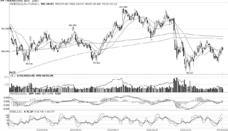 IC加权振荡偏强走势在6400点下方遇阻后转调整,前期高点附近支撑力度待考验,近期量仓等指标配合度变弱。周一早盘大幅低开后振荡回升乏力,再度回落至低位,盘中维持低位振荡走势,临近尾盘回升力度有限,其间量仓变化情况好于预期。当前IC主连合约较现货指数小幅升水,净基差仍未回落至正常水平,期货较现货指数表现明显偏强。主连合约较多减仓,远月合约加减仓差别较大,整体减仓幅度有限,多单减仓后量仓价配合度待提升。 IC当前MACD红柱收窄,KDJ快线自高位回落,日K线振荡调整幅度待观察,建议多单在前高附近加仓,波段操作为主。 十债 择机短多
