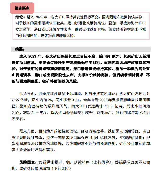 四大矿山一季度展望:发运目标不变 铁矿石供给已进入淡季