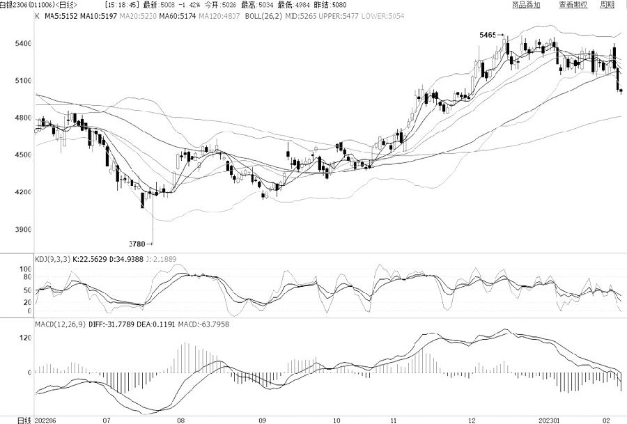 沪铝2303合约自去年7月15日价格触及低点后,开启一轮振荡走势,虽然振荡区间有小幅上移趋势,但仍相对较弱。从K线形态上看,沪铝2303合约去年7月15日、去年11月1日与今年1月5日的低点逐渐抬高,意味着价格中周期上或已见底,下跌破位较为困难。从主要均线来看,沪铝2303合约运行在均线上方,属于略强的走势。 从MACD指标上看,当前指标处于金叉状态,但最近几日红柱略有缩短,指向意义相对不大,KDJ指标当前也无显著的指示意义。从布林通道上看,当前通道开口走扩,价格波动加剧。沪铝2303合约价格短期受到布林通道中轨的支撑,这也是主要均线附近的位置。综合各项指标来看,沪铝2303合约正在振荡筑底的概率较大,下跌空间有限,但做多仍需价格有效突破当前的振荡区间上沿。 白银 上涨趋势已结束