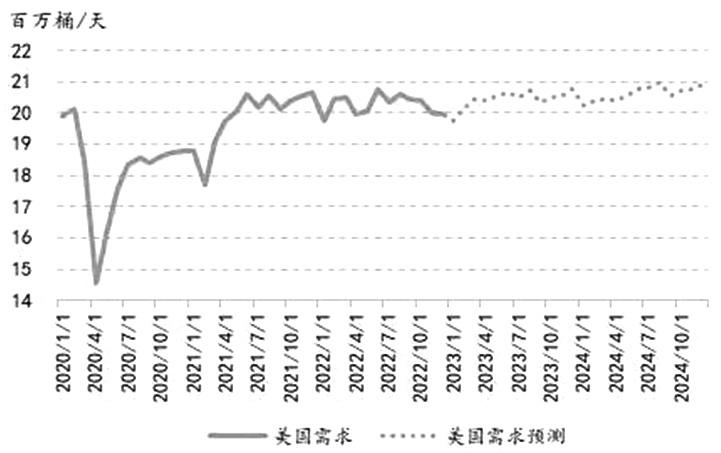 图为EIA关于美国石油需求预测(单位:百万桶/日) D 市场展望 从1月三大机构月报情况来看,OPEC观点和2022年12月相比基本不变,EIA和IEA则分别上调2023年全球石油需求增量5万桶/日和10万桶/日,EIA和IEA相应上调2023年非OPEC石油供应增量30万桶/日和10万桶/日,最终EIA关于2023年Call>整体而言,1月EIA月报展望认为2023年全年的石油供需结构将维持累库格局,预计全年过剩量为61万桶/日,与2022年12月的评估情况相比而言更偏宽松;IEA月报展望则认为2023年上半年全球石油供过于求,下半年将转为供不应求的格局,全年预计供需缺口为60万桶/日,较2022年12月月报而言供需缺口收窄20万桶/日,IEA提高了2023年全球石油供应的预估。 EIA和IEA关于2023年全球石油供需平衡展望的差异主要源于对全球石油需求的分歧,IEA对2023年石油需求的表现更偏乐观,尤其是中国防疫政策的调整预计将带动需求同比增加约85万桶/日,而EIA对于2023年石油需求的预期较为谨慎,认为在疫情的不确定和经济状况令人担忧情况下,2023年的石油需求增速将大幅放缓,因此在海外经济形势不明朗的情况下,需求预测的难度较大。相较而言,关于全球石油供应的预测分歧相对较小,OPEC+减产政策下的产量预计较为稳定,美国石油产量预计将稳定增长。 展望后市,需求方面,海外经济形势更显复杂,美联储加息节奏放缓背景下的美国经济衰退程度和衰退节奏均具有不确定性,从近期美国经济数据来看,软着陆概率或不断增加,其中美国四季度实际GDP年化季环比初值为2.9%,高于预期的2.6%,美国1月Markit综合PMI初值为 46.6,高于预期的46.4和前值45。短期海外原油需求保持一定韧性,但经济衰退担忧预计将持续交易,对油价带来压力。供应方面,OPEC+减产200万桶/日政策前提下的供应预计较为稳定,但需注意俄罗斯在2月5日石油产品价格上限制裁生效后的石油供应情况,目前对俄罗斯石油制裁的影响几近消失,之后对俄成品油出口制裁的影响路径或与之类同,俄罗斯可能加大石油出口量以抵消石油产品出口的减少,届时俄罗斯受制裁影响的程度也将低于预期。 总体而言,OPEC+供应较为稳定,而随着欧美对俄罗斯石油产品的制裁对俄油供应形成制约,预计原油供应稳中偏紧,后市原油市场行情更多关注需求层面,预计市场继续交易国内需求复苏以及欧美需求的弱势,但海外需求在加息放缓情况下显示一定韧性,而国内需求复苏的预期更为明确,预计后期油价将维持振荡偏强走势。