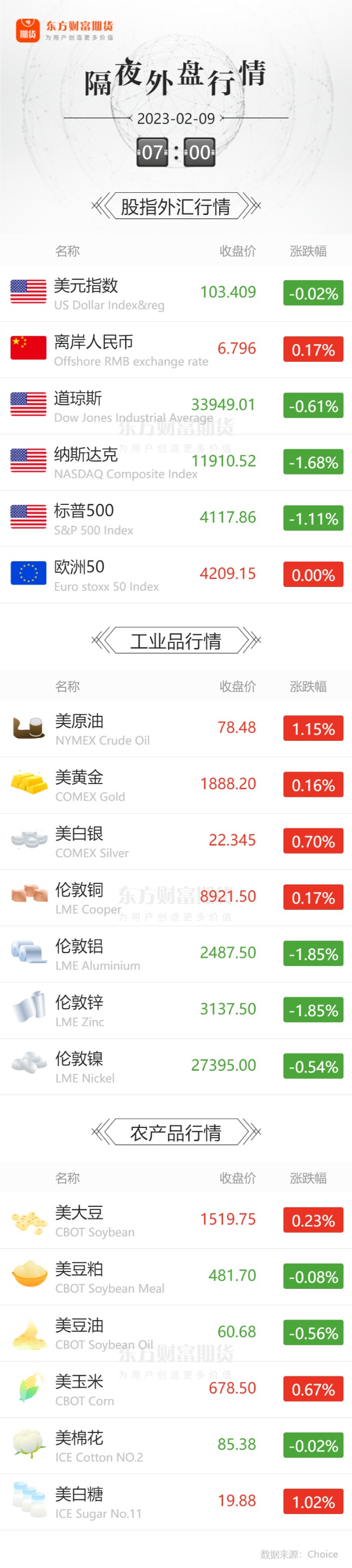 外盘收报![]() 每日精选棕榈油入欧受限马来西亚考虑反制:限制与欧盟的贸易 猪价持续磨底上市猪企减收 发改委启动中央冻猪肉收储 买买买!我国为何连续3个月增持黄金? 转型要“饿死” 转型要“踩线” 期货公司该朝哪里发展? 宏观产经乘联会:1月乘用车市场零售达到129.3万辆,同比减少37.9%。1月新能源乘用车零售销量达到33.2万辆,同比下降6.3%,环比下降48.3%。1月新能源车国内零售渗透率25.7%,较2021年1月17%的渗透率提升8.7个百分点。 工信部:2月8日消息,7日下午,运行监测协调局召开专家座谈会,聚焦当前国内外最新动态、一季度工业经济形势及面临的突出问题、进一步推动工业经济平稳增长的政策措施等开展交流研讨。 澎湃新闻:乘联会秘书长崔东树强调,不必受到1月份低迷数据的干扰,不仅2月将迎来春节之后真正的“开门红”,包括3月和4月也都将走出大幅增长的趋势。 财联社:日前举行的河南省住房和城乡建设工作会议上,相关部门在通报2023年重点工作中明确,河南将以郑州、开封为试点,积极探索预售制度改革和现房销售。此外,四川、安徽、山东等地近期也提出将试点现房销售。 品种资讯黑色系&有色系期货 河北省生态环境厅:推动能源绿色低碳转型。到2025年,力争全省光伏发电装机总规模达到6000万千瓦,风电装机总规模达到4600万千瓦,煤炭消费量较2020年下降10%左右;“十五五”时期煤炭消费占比持续降低。 铁矿石:据Mysteel,2月8日全国主港铁矿累计成交77.5万吨,环比下降1%;本周平均每日成交74.9万吨,环比下降1.3%;本月平均每日成交83.8万吨,环比下降7.8%。 钢厂:据Mysteel,2月8日,全国174家长、短流程代表钢厂废钢库存总量357.67万吨,较昨日增1.06万吨,增0.29%;库存周转天11.1天,较昨日降0.1天;日消耗总量27.8万吨,较昨日增2.58%;日到货总量28.86万吨,较昨日增10.37%。 据Mysteel,本周,唐山主流样本钢厂平均铁水不含税成本为3010元/吨,平均钢坯含税成本3884元/吨,周环比下调28元/吨,与2月8日当前普方坯出厂价格3770元/吨相比,钢厂平均亏损114元/吨,周环比增加62元/吨。 西本新干线:据不完全统计,2月8日约有19家钢厂调整建材出厂价格。其中,螺纹钢价格最高下调60元/吨。 山东省能源局:严格煤炭生产能力管理,组织开展采掘接续提升年活动,在确保安全的前提下,优化矿井开拓布局,积极释放先进产能,全年煤炭产量稳定在8600万吨左右。持续提升煤炭储备能力,加快山东能源唐口、枣矿物流园二期等煤炭储备项目建设,政府可调度煤炭储备能力达到1800万吨以上。 第一财经:2月8日,中国有色金属工业协会硅业分会公布最新硅料价格。从“踩踏式降价”到两周内反弹三成,最新的价格显示硅料价格继续“狂飙”,最高价格甚至飙涨至24.9万元/吨。 伦敦金属交易所:2月8日,伦敦金属交易所铝库存增加105550吨,为近一年来最大涨幅。 财联社:印尼贸易部数据显示,印尼1月份精炼锡出口量为1536.55吨。 农产品期货 财联社:美国农业部(USDA)预计,美国玉米期末库存12.67亿蒲式耳,分析师预期12.7340亿蒲式耳,USDA此前预计12.42亿蒲式耳;预计美国棉花期末库存430万捆,分析师预期408万捆,USDA此前预计420万捆;预计美国大豆期末库存2.25亿蒲式耳,分析师预期2.1124亿蒲式耳,USDA此前预计2.10亿蒲式耳。 农业农村部:8日发布《2023年2月中国农产品供需形势分析》。在本月报告中, 对2022/23年度中国大豆供需形势预测与上月保持一致。国内方面,节后市场交易陆续恢复,下游补库需求较强,国产大豆供给充足,预计价格短期将平稳运行。国际方面,阿根廷受干旱天气影响预期减产,但巴西、巴拉圭等国大豆增产预期较强,全球大豆供应保持宽松格局,预计进口大豆价格短期将受南美天气影响波动运行。 农业农村部:截至2月8日14:00时,全国农产品批发市场猪肉平均价格为21.51元/公斤,较前一日下降0.6%;鸡蛋平均价格为10.37元/公斤,较前一日下降0.3%。 农业农村部:2023年1月30日—2月5日,全国规模以上生猪定点屠宰企业生猪平均收购价格为15.91元/公斤,环比下降4.7%,同比上涨0.6%。白条肉平均出厂价格为21.31元/公斤,环比下降5.2%,同比下降0.2%。 巴西国家商品供应公司CONAB:预计2022/23年度巴西大豆产量达到1.528899亿吨,同比增加2734.01万吨,增加21.8%,环比增加17.71万吨,增加0.1%。 中国大豆产业协会:马托格罗索州农业经济研究所(IMEA)报告说,截至上周五(2月3日),这个巴西头号大豆产区的大豆收获已经完成24%。周二IMEA更新了对该州大豆产量的预测,预计2022/23年度大豆产量创下4282万吨的历史纪录,比12月份预测的4146万吨提高3.28%,比2021/22年度产量提高4.8%。 中国粮油商务网:2月8日马来西亚棕榈油离岸价为970美元/吨,进口到岸价为990美元/吨,较上日持平,进口成本价为8069.7元/吨,较上日跌2.71元,结束两连涨。 能化期货 财联社:俄罗斯副总理诺瓦克表示,俄罗斯将在3月1日前决定应对欧盟对俄石油产品制裁的措施。1月份俄罗斯石油产量为980-990万桶/日,2月份的石油产量与1月份持平。 财联社:伊朗官员表示,预计油价将在2023年下半年上涨至约100美元/桶。OPEC+在下次会议上可能继续现行政策。 伊拉克国家石油营销组织SOMO:伊拉克将3月份销往亚洲的巴士拉中质原油价格定为较阿曼/迪拜均价贴水1.10美元/桶。将3月销往欧洲的巴士拉中质原油价格定在较布伦特原油贴水6.95美元/桶。将3月销往北美和南美的巴士拉中质原油官方销售价格