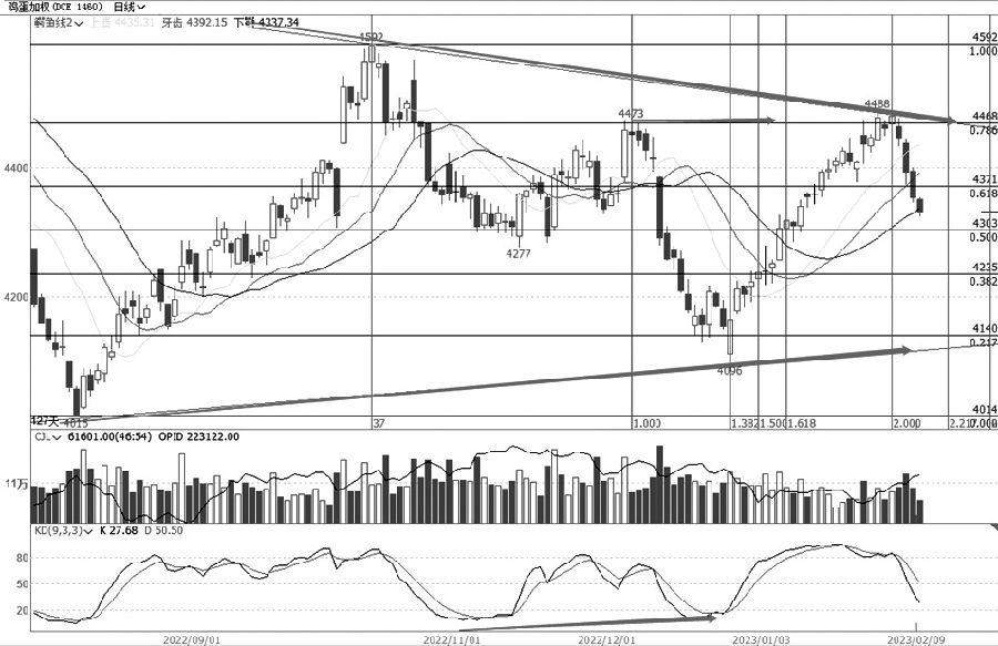 从塑料加权日线走势图可以看出,该品种两个低点7452元/吨、7456元/吨以及高点8391元/吨形成“大双底”形态,随后展开一轮强势反弹,反弹高点8606元/吨,已经有效上破双底颈线位置,但在下跌幅度50%的位置承压走低、展开回落调整。在前期调整、突破冲高以及再次走低的过程中,基本上遵循减仓下行、增仓上行的规律,说明目前走势是一个向上的趋势。昨日塑料收涨,与前面的K线形成了“早晨之星”的反转信号,KD指标也具备了看涨反转的基础,由于调整是快速走低,所以除了短期均线有所勾头,均线系统整体上仍属于多头排列,预计后市仍有走高的可能。 鸡蛋 三角形整理