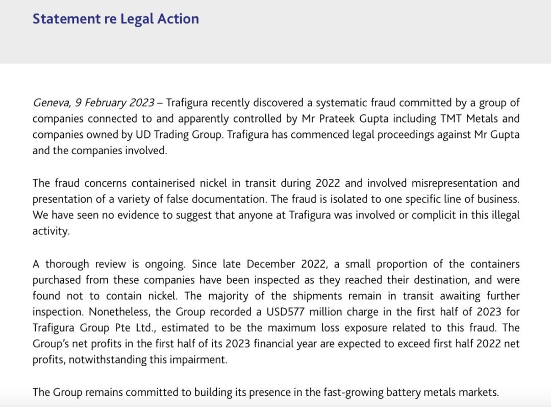 | 全球商品贸易巨头竟然也遭遇交易骗局。 当地时间2月9日,全球商品贸易巨头托克(Trafigura)在官网发布声明称,公司在镍交易过程中碰上了一起骗局。公司预期最多可能造成5.77亿美元(约合人民币39亿元)的损失,并将计入2023年上半年的财报中。 买镍遭遇“挂羊头卖狗肉” 托克此次遭遇了一场“挂羊头卖狗肉”的骗局。 在当地时间2月9日发布的声明中,托克指控,公司发现迪拜金属商人Prateek Gupta控制的一系列公司在交易镍金属的过程中实施“系统性欺诈”。 ![]() 来源:托克官网 声明表示,托克自2015起就开始与这名叫Gupta的商人做金属交易。在2022年圣诞节前,托克的调查员到鹿特丹港检查货物时发现,原本应该装着镍的集装箱里,一点儿镍都没有,只有一些其他金属。 据媒体报道,托克主管镍和钴交易的Socrates Economou已经因此离开了公司。据了解,作为托克最为资深的金属交易员之一,Economou曾在南非、民主刚果和中国主管过多个不同的业务。不过公司在声明中强调,没有发现内部人士参与诈骗的迹象。 或巨亏39亿元 这次骗局或令托克损失惨重。 托克在声明中表示,考虑到更多的集装箱正在运输过程中,公司预计最多可能造成5.77亿美元(约合人民币39亿元)的损失,并将计入2023年上半年的财报中。 不过,托克强调,即便算上这笔损失,公司上半年的利润仍将同比上升。据托克披露,在截至2022年9月末的2022财年,公司净利润同比翻倍至70.26亿美元,营收同比增长38%至近3185亿美元;但金属部门的折旧和摊销前营业利润同比下降24%,金属仅占该公司整体营业利润的16%,创下逾十年来最低。 公开资料显示,托克集团成立于1993年,是全球第二大的独立有色金属精矿贸易公司,也是全球第三大的独立石油贸易公司。 业内人士:警惕交易骗局 据了解,近年来,在大宗商品贸易中,伪造仓库收据、一单多卖、拿石头喷油漆伪装金属的事件并不少见,一些不法分子甚至盯上了普通投资者,利用投机心理来骗取投资者本金。 为何金属贸易骗局频出? 业内人士称,由于电动车产业兴起、俄乌冲突、LME镍交易风波等因素,镍的价格要比其他基础金属贵很多。按照LME最新报价,一吨镍价格大约在3万美元左右,而每吨铜的价格只有9000美元,单单一个集装箱的镍,价值就能达到50万美元。由于交易量大且运输过程中不像黄金那样有专门安保,镍也常常被诈骗犯盯上。 对于普通投资者,业内人士也提醒,警惕各种自称“XX客服”等推荐的群聊及非官方渠道下载的投资类APP;建议投资者理性投资,更多学习投资理财相关的法律法规和金融知识。 (文章来源:中国证券报) (责任编辑:admin) |