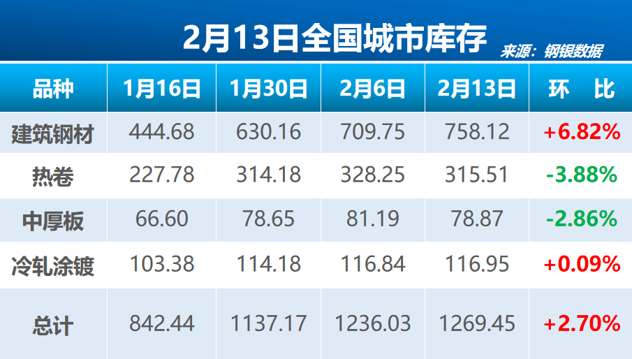 | 钢银电商13日公布数据显示,截至2月13日当周,全国39个城市,共计147个仓库的城市钢铁总库存量为1269.45万吨,环比增加33.42万吨,增幅2.70%。 其中,建筑钢材(包含30个城市,共计88个仓库)库存总量为758.12万吨,环比增加48.37万吨,增幅6.82%。热卷(包含16个城市,共计49个仓库)库存总量为315.51万吨,环比减少12.74万吨,降幅3.88%。中厚板(包含9个城市,共计15个仓库)库存总量为78.87万吨,环比减少2.32万吨,降幅2.86%。冷轧涂镀(包含6个城市,共计15个仓库)库存总量为116.95万吨,环比增加0.11万吨,增幅0.09%。 ![]() (文章来源:新华财经) (责任编辑:admin) |