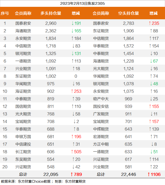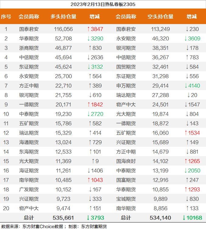 | 截至2月13日收盘,螺纹钢2305收3993/吨,跌1.6%;热卷2305收4082/吨,跌1.42%;铁矿石2305收841.5元/吨,跌2.21%;焦炭2305收2686.5/吨,跌2.7%;焦煤2305收1789元/吨,跌2.9%。 螺纹钢2305合约前20席位多单减仓24794手至111.7万余手,空单增仓19619手至128.7万余手,整体呈净空170166手。其中,银河期货多单减持13695手,空单减持1004手,整体呈净空2972手。 各品种具体如下: ![]() 各品种持仓情况具体如下: ![]() ![]() ![]() ![]() ![]() (文章来源:东方财富研究中心) (责任编辑:admin) |