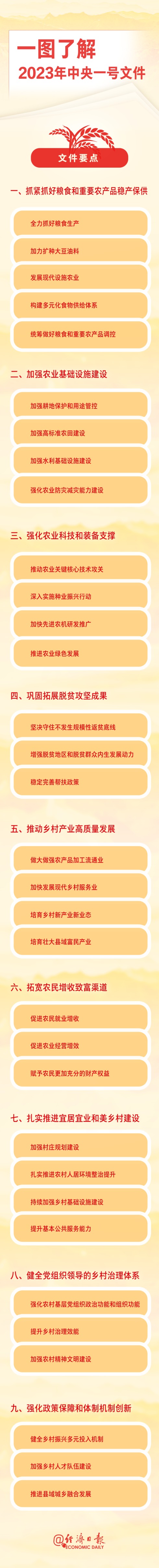 | 21世纪以来第20个指导“三农”工作的中央一号文件13日发布。 这份文件题为《中共中央国务院关于做好2023年全面推进乡村振兴重点工作的意见》,全文共九个部分,包括:抓紧抓好粮食和重要农产品稳产保供、加强农业基础设施建设、强化农业科技和装备支撑、巩固拓展脱贫攻坚成果、推动乡村产业高质量发展、拓宽农民增收致富渠道、扎实推进宜居宜业和美乡村建设、健全党组织领导的乡村治理体系、强化政策保障和体制机制创新。 文件指出,全面建设社会主义现代化国家,最艰巨最繁重的任务仍然在农村。世界百年未有之大变局加速演进,我国发展进入战略机遇和风险挑战并存、不确定难预料因素增多的时期,守好“三农”基本盘至关重要、不容有失。党中央认为,必须坚持不懈把解决好“三农”问题作为全党工作重中之重,举全党全社会之力全面推进乡村振兴,加快农业农村现代化。 文件提出,坚决守牢确保粮食安全、防止规模性返贫等底线,扎实推进乡村发展、乡村建设、乡村治理等重点工作,加快建设农业强国,建设宜居宜业和美乡村。 中央农村工作领导小组办公室有关负责人表示,要全面贯彻落实党的二十大精神,深入贯彻落实习近平总书记关于“三农”工作的重要论述,全面落实乡村振兴责任制,真抓实干做好2023年重点工作,不折不扣完成好既定目标任务,推动全面推进乡村振兴不断取得新进展、农业强国建设开好局起好步。 ![]() (文章来源:经济日报) (责任编辑:admin) |