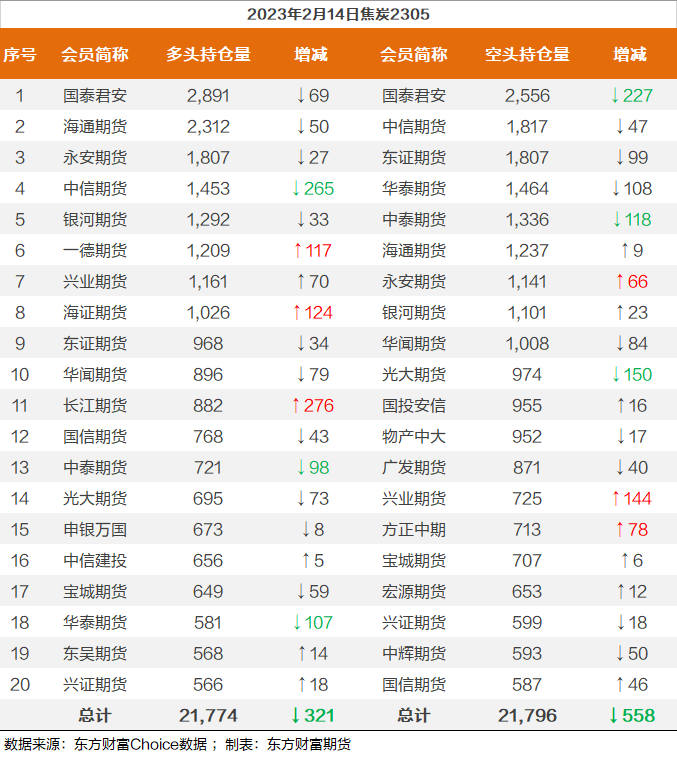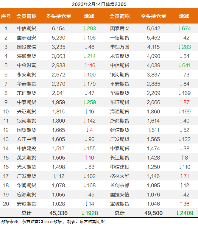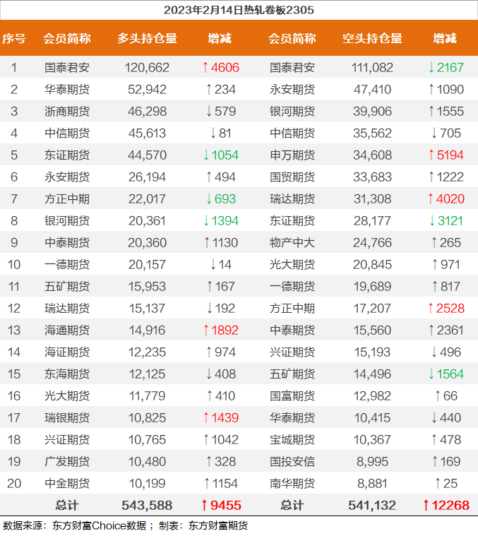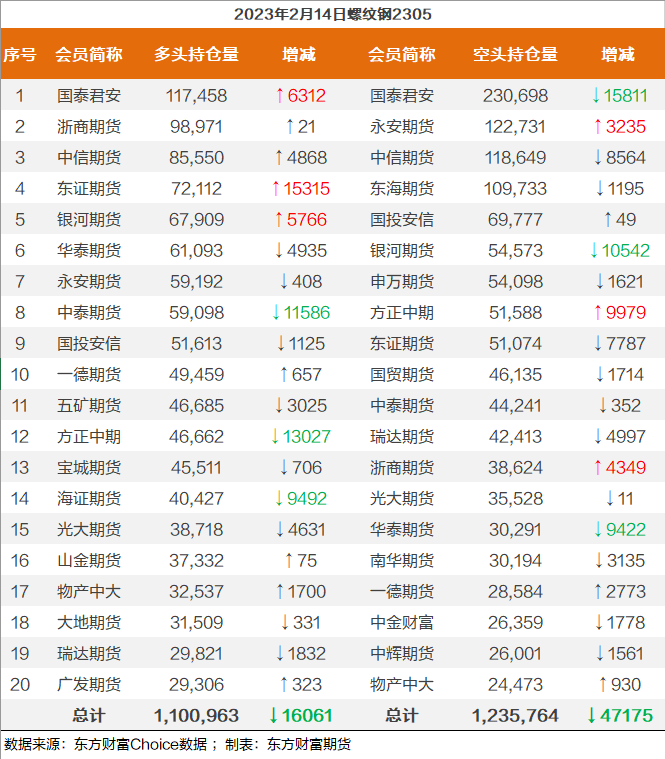 | 截至2月14日收盘,螺纹钢2305收4027/吨,跌0.1%;热卷2305收4132/吨,涨0.34%;铁矿石2305收856.5元/吨,涨0.41%;焦炭2305收2701/吨,跌0.26%;焦煤2305收1813元/吨,涨0.06%。 螺纹钢2305合约前20席位多单减仓16061手至110万余手,空单减仓47175手至123.5万余手,整体呈净空134801手。其中,国泰君安期货多单增持6312手,空单减持15811手,整体呈净空113240手。 各品种具体如下: ![]() 各品种持仓情况具体如下: ![]() ![]() ![]() ![]() ![]() (文章来源:东方财富研究中心) (责任编辑:admin) |