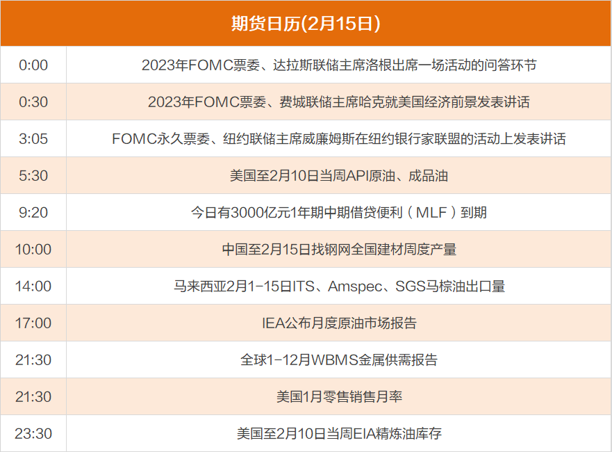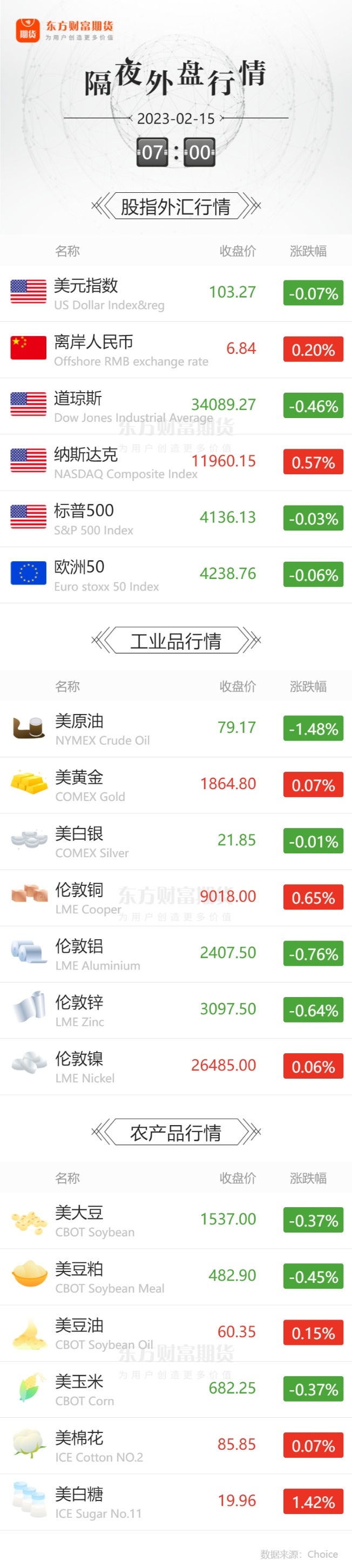 外盘收报![]() 每日精选美国1月CPI同比上涨6.4% 高于预期 油市供应将趋紧!OPEC上调今年全球原油需求预期 “一号文件”持续聚焦大豆扩种 大豆进口依赖度有望连年降低 拜登政府欲再释放2600万桶原油 此举背后有何玄机? 全球第二大铜矿因暴雨停产 铜资源短缺冲击市场 宏观产经财联社:美国1月CPI同比上涨6.4%,预估上涨6.2%,前值为上涨6.5%。美国1月CPI环比上涨0.5%,预估上涨0.5%,前值为下降0.1%。 央视新闻:欧洲议会在斯特拉斯堡以340票赞成,279票反对和21票弃权,通过了欧委会和欧洲理事会达成的《2035年欧洲新售燃油轿车和小货车零排放协议》。这也表明,欧洲将在2035年停售新的燃油轿车和小货车。按照协议内容,欧盟的中期目标是在2030年实现燃油轿车减排55%,小货车减排50%。之后,该协议将交由欧洲理事会通过并最终实施。 中国新闻网:近日,农业农村部印发《关于进一步做好机械化播种质量提升工作的通知》,要求各级农业农村部门将提升机播质量摆到粮油生产工作和农业机械化工作重要位置,加强组织领导,从今年春耕春播开始,迅速行动、常抓不懈,为实施主要粮油作物单产提升行动增强机械化支撑。 品种资讯黑色系&有色系期货 螺纹钢:2月上旬,21个城市5大品种钢材社会库存1341万吨,环比增加183万吨,上升15.8%,库存上升幅度有所收窄;比年初增加589万吨,上升78.3%;比上年同期增加105万吨,上升8.5%。(中钢协) 2月14日,全国174家长、短流程代表钢厂废钢库存总量373.85万吨,较昨日增3.32万吨,增0.89%;库存周转天10.4天,较昨日持平;日消耗总量30.47万吨,较昨日增2.43%;日到货总量33.78万吨,较昨日增4.4%。 2月14日,沙钢废钢下调50元/吨。调后执行价:重一3210重二3180重三3150,含税13%,具体废钢价格以2023-F2价格为准。(Mysteel) 铁矿石:2月6日-12日,澳大利亚、巴西七个主要港口铁矿石库存总量1260.4万吨,周环比增加143.8万吨,处于近半年的高位水平。(Mysteel) 煤炭:随着煤炭价格的持续下跌,各方观望情绪较浓,贸易商出货意愿不强,市场交易冷淡。货盘有少量释放,沿海煤炭运价底部企稳。(上海航运交易所) 有色金属:铝库存增加24825吨,铜库存增加1225吨,镍库存减少1248吨,铅库存持平,锡库存减少5吨,锌库存减少600吨。(伦敦金属交易所LME) 铜:2月13日,据路透社消息,美国矿业巨头自由港麦克莫兰(Freeport-McMoRan)位于印尼的铜矿格拉斯伯格(Grasberg)于上周末因暴雨导致洪水和泥石流而停产,预计该矿要到本月底才能恢复运营。(界面新闻) 工业硅:硅业分会指出,虽然目前硅片阶段性供不应求,涨价也在情理之中,但仍需考虑一季度整体需求运行情况,因此预计短期内硅片涨速或将放缓,甚至持稳运行。(证券日报网) 农产品期货 生猪:据农业农村部监测,截至2月14日14:00时,全国农产品批发市场猪肉平均价格为20.32元/公斤,与昨天持平;鸡蛋10.30元/公斤,比昨天上升0.3%。(新华财经) 据对全国流通领域9大类50种重要生产资料市场价格的监测显示,2023年2月上旬与1月下旬相比,12种产品价格上涨,35种下降,3种持平。其中,生猪(外三元)价格为14元/千克,较1月下旬相比下降2.1%。(国家统计局) 大豆:中央农办主任、农业农村部部长唐仁健表示,健全种粮农民收益保障机制,继续提高小麦最低收购价,合理确定稻谷最低收购价,稳定稻谷补贴,完善玉米大豆生产者补贴,提高大豆补贴力度,推动扩大大豆政策性收储和市场化收购,逐步扩大稻谷、小麦、玉米完全成本保险和种植收入保险实施范围,完善农资保供稳价应对机制。同时还要健全主产区利益补偿机制,增加产粮大县的奖励资金规模。(中国网) 截止到2月13日,巴西各港口大豆对华排船计划总量为631.3万吨,较2月6日增加82.9万吨。发船方面,2月份以来巴西港口对中国已发船总量为178.4万吨,较2月6日增加120万吨。(Mysteel) 玉米:2022年,全国工业饲料总产量30223.4万吨,比上年增长3.0%;全国饲料生产企业的玉米用量比上年增加30.1%,在配合饲料中的比例比上年提高7.0个百分点。(中国饲料工业协会) 小麦:市场交易人士愈发担心俄乌冲突会走向恶化,从而影响黑海谷物出口协议的前景。这一顾虑反映在了市场上,周一芝加哥小麦期货价格接近两个多月来的最高水平。(财联社) 能化期货 原油:周二(2月14日),拜登政府表示,计划从战略石油储备(SPR)中出售更多原油,这是美国国会2015年时为本财年制定的预算授权的一部分。美国国会授权的此次出售规模为2600万桶原油,预计交付日期为4月1日至6月30日。目前美国的战略储备总量约为3.71亿桶。在这次出售计划实施之后,战略储备将下降到大约3.45亿桶。(财联社) 欧佩克月报显示,2023年全球原油需求增速预测为230万桶/日,此前预计为222万桶/日。将俄罗斯2023年石油产量预测从1018万桶/日下调至1013万桶/日。(财联社) 玻璃:目前多地产销一般,下游需求启动缓慢,多数企业产销尚不能做平,原片企业库存持续上涨下,不乏个别企业价格灵活调整,整体观望情绪偏浓。预计明日价格弱稳整理,运行区间在1680—1686元/吨。(隆众资讯) 纯碱:昨日,国内纯碱市场走势淡稳,价格相对坚挺。据了解,金山(孟州)厂区装置停车检修,预计检修4天,其他装置平稳运行。企业出货顺畅,产销平衡,库存延续低位震荡态势。下游需求维稳运行,轻质表现不温不火,重碱需求尚可。从趋势看,短期现货持稳运行。(隆众资讯) 环球视野波罗的海干散货运价指数:跌53点或8.6%,报563点,为