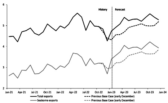图为乌拉尔与布伦特原油价差 关注油价在上档阻力位的表现 俄罗斯的原油出口能力是影响原油市场的一个关键因素。去年12月,七国集团、欧盟和澳大利亚三方对俄罗斯原油制裁实施后,导致俄罗斯原油出口短期回落。从今年1月的数据来看,俄罗斯海运原油装载量平均为330万桶/日,高于市场预期,甚至在1月的第三周达到350万桶/日。继2月5日生效的欧盟禁运和G7价格上限短期对成品油出口造成干扰之后,能源研究机构Rystad Energy预计3月俄罗斯油品出口量将比1月下降约53万桶/日。