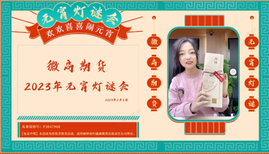 大地春,花灯闹元宵。元宵节当日,徽商期货开展了元宵节灯谜直播闯关活动。本次活动是以期货知识为谜底,直播答对灯谜的投资者即可获得元宵节奖品。 活动当日观看客户数超过千人,客户评论分享近1500次。经过激烈抢答,最终15位客户获得活动奖品。值得注意的是,本次活动中有部分奖品来自桐柏县金淮豆种植专业合作社。不久前,该合作社负责人还在为品牌宣传推广着急,徽商期货借此活动契机,向观看投资者大力宣传了合作社农副产品,让“酒香”也“不怕巷子深”。