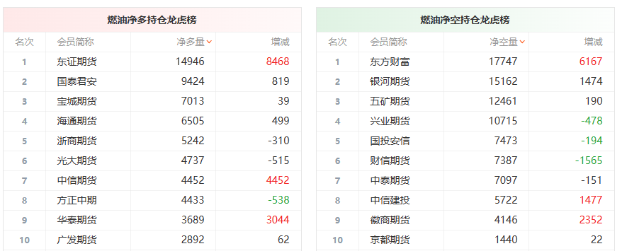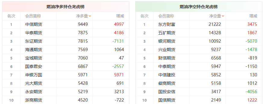 | 今日(2月16日)燃料油2305收于2906元/吨,收涨2.87%,日内持仓增加5.4万手至43.7万手,资金净大幅流入5.52亿。 今日前20家席位在燃料油2305合约上多单增加3.7万手至32.9万手,空单增加2.4万手至33.4万手,整体呈净空4694手,多空比自2月以来显著攀升。 ![]() 就多单而言, 前三席位中,中信期货和华泰期货席位近2日净多持仓均显著增加, 中信期货席位2日来净多合计增仓近万手;申银万国席位今日净多单增加近6千手,增幅较大。此外,此前位于净多榜首的东证期货席位今日净多单大幅减少近50%。 2月15日 ![]() 2月16日 ![]() 就空单而言,东方财富期货、五矿期货席位近2日净空增仓较多,而此前位于净空榜首的银河期货席位今日减仓显著。 数据显示,近一段时间来,目前位于净多榜首的中信期货席位,其净持仓与期价走势呈一定程度正相关。 ![]() 总体而言,燃料油2305合约多空排名前20席位近2日均呈进场态势,且多头进场力量显著强于空头。此外,中信期货席位近日净多持仓显著增加,数据显示,该席位近一段时间以来净持仓与期价走势呈正相关。 注:可通过点击东方财富期货PC端左侧“龙虎榜”栏目查看各类机构持仓及盈亏榜单信息。