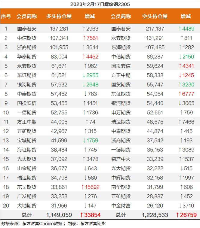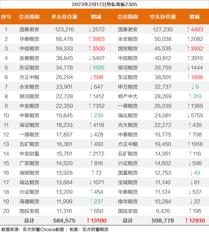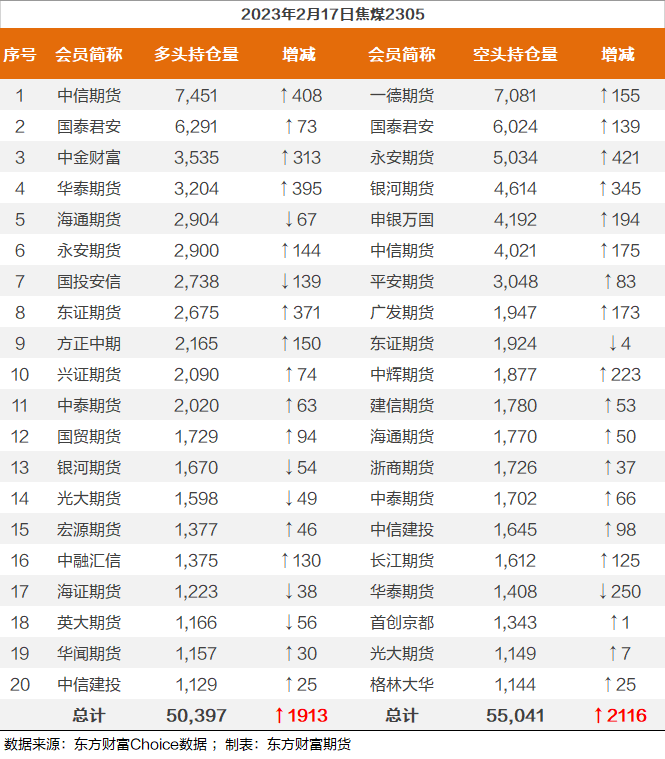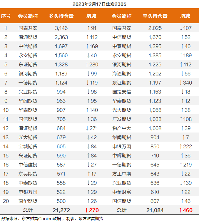 | 截至2月17日收盘,螺纹钢2305收4167/吨,涨1.36%;热卷2305收4240/吨,涨0.98%;铁矿石2305收889.5元/吨,涨2.01%;焦炭2305收2831.5/吨,涨3.15%;焦煤2305收1897元/吨,涨2.6%。 螺纹钢2305合约前20席位多单增仓33854手至114.9万余手,空单增仓26759手至122.8万余手,整体呈净空79474手。其中,中信期货多单增持7561手,空单减持2150手,整体呈净多21054手。 各品种具体如下: ![]() 各品种持仓情况具体如下: ![]() ![]() ![]() ![]() ![]() (文章来源:东方财富研究中心) (责任编辑:admin) |