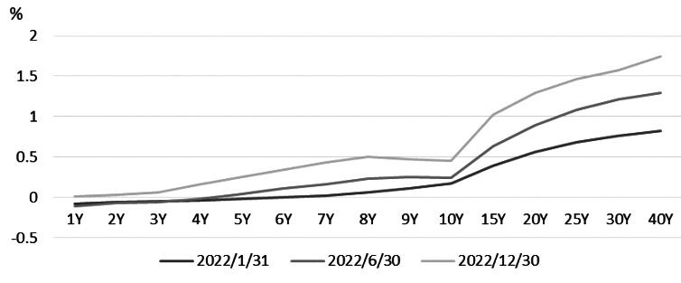 2022年9月7日,中国金融期货交易所(下称中金所)与日本交易所集团(下称日交所)签署合作谅解备忘录,进一步推动双方衍生品市场合作发展。 中日国债市场简介 截至2021年年末,日本和中国的政府债务余额分别名列全球第二位和第三位。 截至2022年年末,中国地方债余额为34.9万亿元人民币(约合5.2万亿美元),占政府债务余额的58%。 为覆盖不断攀升的财政赤字,日本国债余额持续增加,截至2022年年末已超过1000万亿日元(约合8万亿美元)。 中国人民银行实施稳健的货币政策,通过公开市场操作调控中短端利率。2022年2—7月,中国CPI同比增速由0.9%上升至2.7%。受银行体系流动性合理充裕影响,短期利率水平持续下行。 为保持较低的债券收益率,日本央行采取了一系列非传统货币政策,对国债市场影响巨大。2013年4月实施量化质化货币宽松(QQE),2016年9月宣布实施收益率曲线控制(YCC)。收益率曲线控制的核心是针对金融机构的超额准备金实施负利率,并通过购买日本国债将10年期国债收益率控制在目标利率上下0.5%的政策区间内(此前为0.25%),实现对短端和长端利率的控制。