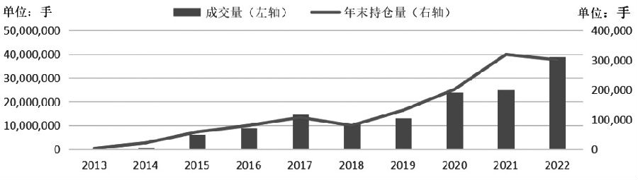 图为中国国债期货年度成交持仓情况 在日本国债市场中,传统上银行是最大的持债方,但自2013年日本实施货币宽松政策后,其国内银行持有日本国债占比大幅缩减。2015年,日本央行购买了大量日本国债,成为日本国债的最大持有者。 中国国债市场成交额稳步增加,2022年达到55万亿元人民币(约合8.2万亿美元)。 在超低利率环境下,2021年日本国债现货成交额刷新历史纪录,达到24000万亿日元(约合200万亿美元)。 中金所与日交所国债衍生品市场情况 与现货市场一致,中日两国场内国债衍生品市场也较为活跃。 随着国债现货规模的大幅增长,中国国债期货市场保持稳健发展态势,产品体系不断丰富,流动性持续改善,投资者结构日益完善。 1985年,首个日本国债衍生品——10年期日本国债期货上市,随后持续拓展产品供给,优化交易制度和系统,包括延长交易时间、引入日历价差交易和场外协商交易等。 中日国债期货合约最大的差异在于合约规模和标的。以10年期国债期货为例,中国国债期货合约规模为100万元人民币(约合20万美元),日本国债期货合约规模则为1亿日元(约合90万美元)。 10年期中国国债期货的可交割标的为票面利率3%、发行期限不高于10年、合约到期月份首日剩余期限不低于6.5年的附息中国国债;10年期日本国债期货的可交割标的为票面利率6%、发行期限不高于11年、合约到期月份首日剩余期限不低于7年的附息日本国债。 成交量方面,随着国债现货市场规模的快速增长,机构投资者类型不断丰富,中国国债期货市场也在稳步发展。10年期中国国债期货约占全部国债期货成交量的50%,2年期和5年期约占全部成交量的20%和30%。2022年,中国国债期货日均成交额约为1918亿元人民币(约合28.4亿美元)。