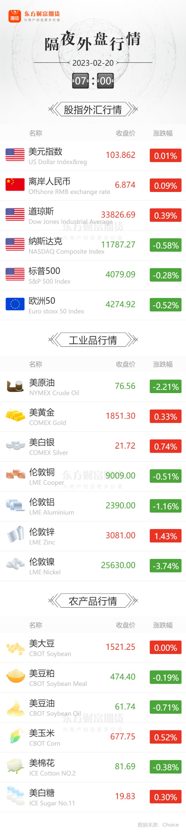 外盘收报![]() 每日精选国家开展今年第一批中央冻猪肉储备收储工作 山东海化:拟以不超6亿元自有资金开展纯碱期货套期保值业务 大商所:近期铁矿石等品种价格波动较大 国内成品油调价年内首次搁浅 未来油价会如何走? 深夜崩了!内外盘原油急跌 沙特最新表态!G7懵了:俄油越卖越火 宏观产经证监会:2023年2月17日,中国证监会发布全面实行股票发行注册制相关制度规则,自公布之日起施行。证券交易所、全国股转公司、中国结算、中证金融、证券业协会配套制度规则同步发布实施。 银保监会、央行:就《商业银行资本管理办法(征求意见稿)》公开征求意见,按照银行间的业务规模和风险差异,划分为三个档次银行,匹配不同的资本监管方案。其中,第一档规模较大或跨境业务较多的银行,对标资本监管国际规则;第二档资产规模和跨境业务规模相对较小的银行,实施相对简化的监管规则;第三档主要是规模小于100亿元的商业银行,进一步简化资本计量并引导聚焦服务县域和小微。 财联社:在美国经济数据显示通胀将持续、劳动力市场仍具有弹性后,两家华尔街巨头高盛和美国银行调整了对美联储利率的定价预期,他们预计美联储今年将再加息三次。高盛经济学家Jan Hatzius领导的团队周四公布的一份报告写道,“鉴于强劲的经济增长和更顽固的通胀,我们认为美联储将在6月份再加息25个基点,届时联邦基金利率峰值将达到5.25%-5.5%。” 品种资讯黑色系&有色系期货 螺纹钢:2月17日上午邯郸市发布重污染天气橙色预警启动II级应急响应。Mysteel了解到邯郸地区本轮限产后,多家钢厂表示计划烧结限产50%。截至2月15日Mysteel烧结矿数据显示,邯郸市7家钢铁企业(产能占比55%),烧结矿日产7.1万吨,产能利用率76%;目前区域内烧结矿库存平均可用天数6天,若持续烧结限产,产能利用率降至50%,预计能坚持23天左右。 上周,Mysteel调研247家钢厂高炉开工率79.54%,环比上周增加1.12%,同比去年增加9.96%;高炉炼铁产能利用率85.75%,环比增加0.82%,同比增加10.31%;钢厂盈利率35.93%,环比下降2.60%,同比下降45.02%。(我的钢铁网) 铁矿石: 上周,Mysteel统计全国45港进口铁矿库存为14110.72万吨,环比增100.44万吨;日均疏港量314.41万吨,增8.96万吨。47港进口铁矿石库存总量14785.72万吨,环比增88.44万吨,47港日均疏港量332.21万吨,环比增12.36万吨。 2月17日铁矿石成交量:全国主港铁矿累计成交103.5万吨,环比上涨8.9%;本周平均每日成交99.5万吨,环比上涨30.6%;本月平均每日成交89万吨,环比下降2.1%。 远期现货:远期现货累计成交57.3万吨(4笔),环比下降51.2%(其中矿山成交量为27.3万吨);本周平均每日成交83.8万吨,环比上涨21%;本月平均每日成交80.6万吨,环比下降16.2%。(我的钢铁网) 煤炭:煤价回落至限价区间内,下游需求逐步释放,交投情绪逐步升温,锚地船舶陆续投入,市场成交活跃,商谈氛围回归正常,沿海煤炭运价继续上行。(上海航运交易所) 有色金属:本周铜库存增加7589吨,铝库存增加22432吨,锌库存增加15744吨,铅库存增加26349吨,镍库存减少97吨,锡库存增加888吨。(上期所) 伦敦金属交易所库存日报,铝库存减少5875吨,铜库存减少150吨,镍库存减少258吨,铅库存增加300吨,锡库存增加35吨,锌库存持平。(新华财经) 铜:据《赞比亚商业时报》等当地媒体和彭博2月17日消息,赞比亚财政部数据显示,该国2022年共开采763288吨铜,同比减少4.7%,为2015年以来最低水平,尽管价格上涨且当局推出税收优惠政策促进生产。(界面新闻) 硅铁:截至2月17日当周,136家独立硅铁企业开工率下降0.15%至45.45%,日均产量为17078吨,较上期减少275吨,均处于近7个月高位。(我的钢铁网) 白银:从河南省地质局获悉,河南省第二地质矿产调查院有限公司在三门峡灵宝市董家埝发现大型银矿,价值45亿。(财联社) 农产品期货 生猪:为推动生猪价格尽快回归至合理区间,发展改革委会同有关方面开展年内第一批中央冻猪肉储备收储工作,拟于近日收储2万吨冻猪肉,并指导各地同步开展地方政府猪肉储备收储。(国家发改委) 截至2月17日14:00时,全国农产品批发市场猪肉平均价格为20.97元/公斤,较前一日上升1.9%。(农业农村部) 本周生猪养殖利润仍处于亏损区间,亏损幅度略有缩小。数据显示,截至2月17日当周,自繁自养生猪养殖利润为亏损336元/头,前一周为亏损396元/头;外购仔猪养殖利润为亏损391元/头,前一周为亏损446元/头。(上证报) 大豆:美国农业部周度出口销售报告显示,截至2023年2月9日当周,美国对中国(大陆地区)的大豆净销售量约为47.3万吨,其中28.4万吨2022/23年度交货,18.9万吨在2023/24年度交货。作为对比,之前一周的销售量为57.2万吨,其中51.89万吨2022/23年度交货,5.3万吨在2023/24年度交货。(中国大豆产业协会) 根据Mysteel对全国主要油厂的调查情况显示,第7周(2月11日至2月17日)111家油厂大豆实际压榨量为170.22万吨,开机率为57.2%。预计第8周(2月18日至2月24日)国内油厂开机率继续下降,油厂大豆压榨量预计157.28万吨,开机率为52.85%。具体来看,下周部分市场因油厂断豆停机;以及豆粕库存偏高,短期降低开机率。(我的钢铁网) 棉花:2月17日美棉M1-1/8到港价因美元走强下跌98元/吨,报16255元/吨;国内3128B皮棉均价因市场现货需求不强下跌107元/吨,报15235元/吨;内外棉价差扩大9元/吨至-1020元/吨。(我的农产品网) 能化期货 成品油:自2023年2月3日国内成品油价格调整以来,国际市场油价震荡运行,按