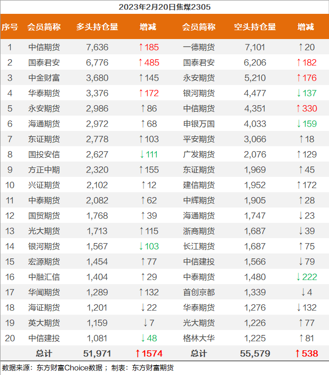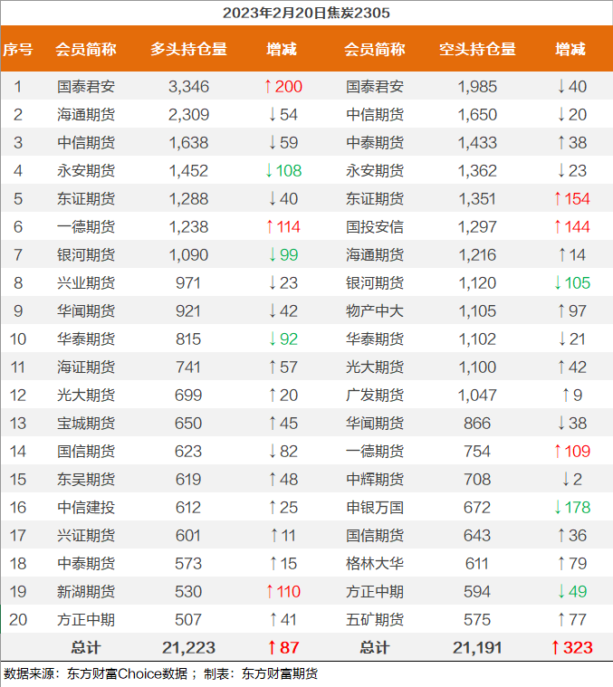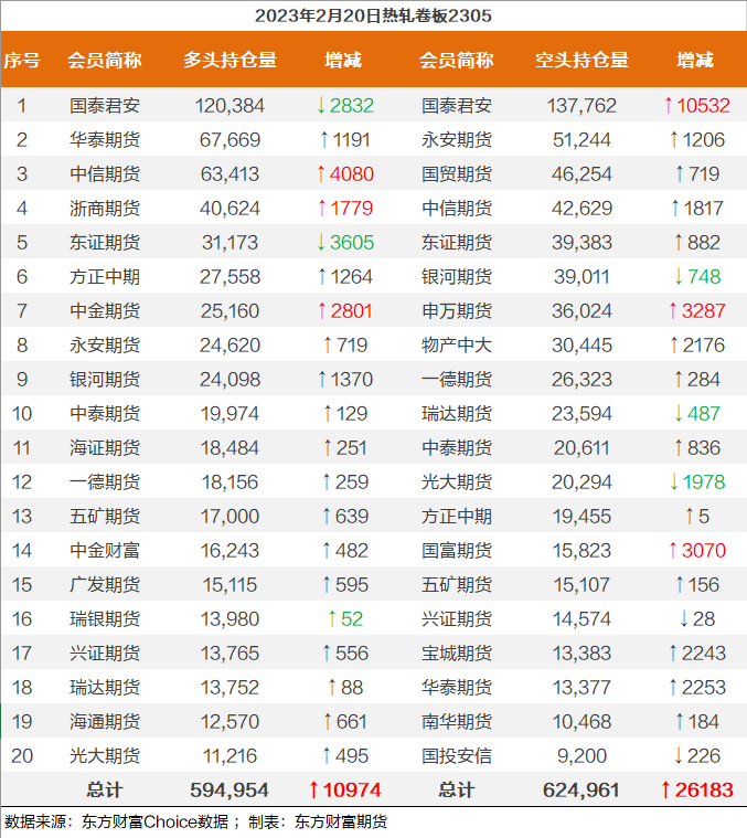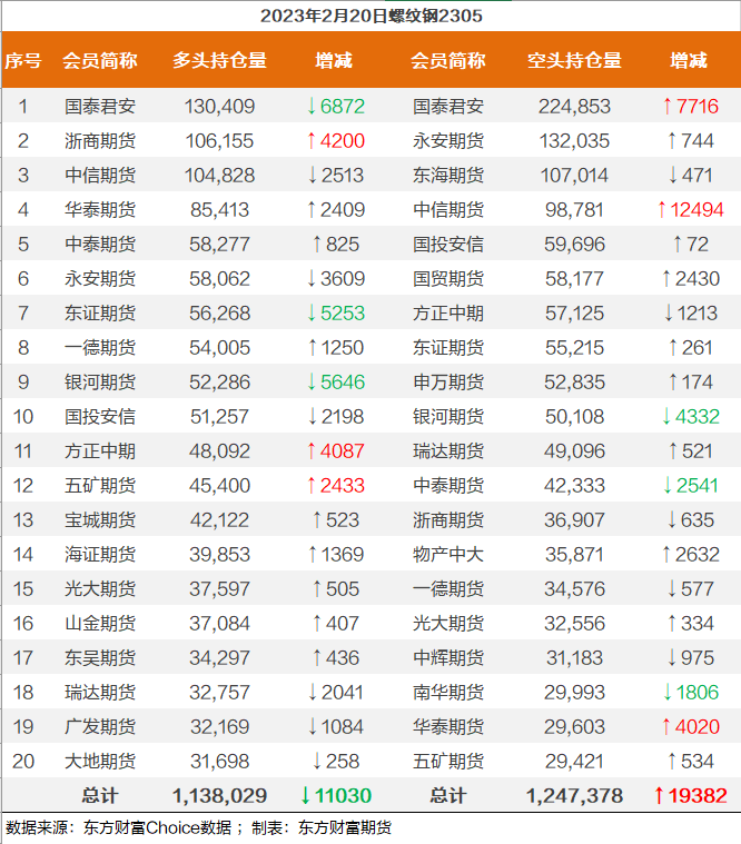 | 截至2月20日收盘,螺纹钢2305收4184/吨,涨0.53%;热卷2305收4264/吨,涨0.49%;铁矿石2305收894元/吨,涨1.02%;焦炭2305收2859/吨,涨1.71%;焦煤2305收1925元/吨,涨2.18%。 螺纹钢2305合约前20席位多单减仓11030手至113.8万余手,空单增仓19382手至124.7万余手,整体呈净空109349手。其中,中信期货多单减持2513手,空单增持12494手,整体呈净多6047手。 各品种具体如下: ![]() 各品种持仓情况具体如下: ![]() ![]() ![]() ![]() ![]() (文章来源:东方财富研究中心) (责任编辑:admin) |
