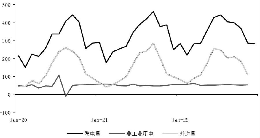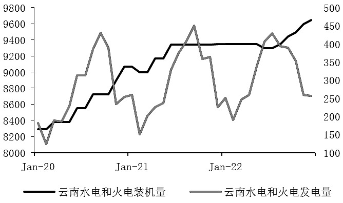图为云南水电和火电发电量及装机量 云南的电力供应预期 云南的电力供应波动性较大,但当前能确定的有两点:一是云南主要水库的水位仍有下降空间;二是即使下降水位增加水电出力,中性预期下大概率发电系数2月至4月能在0.02以上。 对于云南的电力供应预期,从水电、火电和新能源发电拆分来看。首先,在云南水电的供应上,假设随后两个月的发电系数保持前几年的平均出力,那么预期2月至4月发电量分别为:162亿千瓦时、165亿千瓦时、173亿千瓦时,与2022年同期比分别为增加8亿千瓦时、下降27千瓦时、下降47亿千瓦时。 其次,在云南火电的供应上,近期煤炭价格下降明显,走势持续偏弱,火力发电成本优势凸显。因此假设火电出力依旧维持在55亿千瓦时/月的水平高位,给予云南火电55亿千瓦时/月的供应预期。 最后,在云南新能源发电上,现有新能源发电主要是风力发电和太阳能发电。云南各类电力的年发电时间基本稳定,但是具有一定的季节性,风电和光伏发电亦是如此。新能源发电出力相对较稳定,给予新能源发电30亿千瓦时左右的供应预期。 根据以上假设综合来看,云南的电力供应在2月至4月预期分别是在247亿千瓦时、250亿千瓦时、258亿千瓦时,较去年同期的变化分别为增长26亿千瓦时、下降31亿千瓦时、下降26亿千瓦时。即3月和4月份电力供应有下降预期。 B 需求同比增减不一 我们对云南的用电结构简单拆分为三块:本地非工业用电(含居民用电、农业和服务业用电)、本地工业用电和西电东送。在云南的电力需求结构中,2022年居民、农业和服务业用电等非工业用电增速约4%,基本在55亿千瓦时,这部分用电增长可忽略不计。因此云南用电需求主要是本地工业用电和外送电量这两部分。 根据云南省统计局1月19日公布的数据,云南2022年全社会用电量约2390亿千瓦时,同比增长11.8%;其中,工业用电量约1729亿千瓦时,同比增长15%。从用电分布来看,工业用电在云南全社会用电中占比72%左右。除本地用电外,云南2022年外送电量约1820亿千瓦时,同比减少0.5%。 具体来看,云南的工业用电主要集中在黄磷、工业硅、钢铁、水泥、电解铝等几个行业。而在云南所有工业细分领域中,截至2月初云南的非铝行业的开工均处于负增长的状态,仅电解铝的开工明显高于往年,是去年以来工业需求增量明显的子行业。按照目前的开工测算,除电解铝外主要的工业用电带来7亿—7.1亿千瓦时的电力需求减量(其中水泥-4.5亿千瓦时、黄磷-1.2亿千瓦时、螺纹-0.5亿千瓦时、工业硅-0.85亿千瓦时)。 未来季节性开工提升预期主要是水泥和黄磷行业,预期3—4月该部分的电力需求将面临回补。因此,非电解铝行业的2月、3月、4月的电力需求减量预期在7亿千瓦时、1.3亿千瓦时、1.3亿千瓦时。