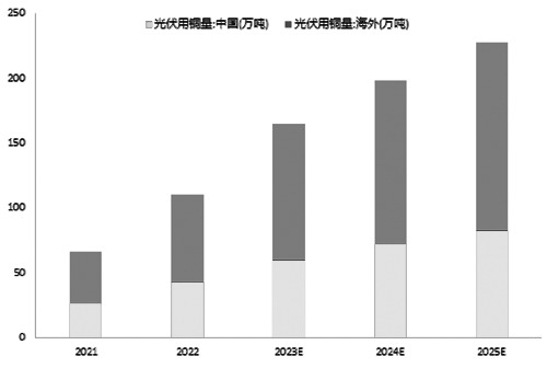 图为光伏耗铜量 2020年《风能北京宣言》提出,在“十四五”规划中,为风电设定与“碳中和”国家战略相适应的发展空间,保证年均新增装机50GW以上,2025年后风电年均新增装机容量应不低于60GW。截至2022年年底,新增风电装机量83.91GW。基于上述目标,2023—2025年年均装机量应超过55GW,其中陆上风电占比约90%。海上风电的用铜强度明显高于陆上风电,陆上风电单位GW装机耗铜量为0.5万吨,海上风电单位GW装机耗铜量为1.5万吨,2023年全球风电用铜量有望达到81万吨。 根据国家统计局的数据,2022年国内汽车产量为2747.6万辆,同比增长3.57%,增长贡献全部来源于新能源汽车,新能源汽车产量为721.9万辆,同比增长96.3%。虽然随着新能源汽车渗透率的抬升,产销增速逐步放缓,但在2023年促销费、稳增长政策不断加码的背景下,新能源汽车产量仍有望超过900万辆。机构预测,全球新能源汽车产量也将保持较高速度的增长。Copper Alliance的数据显示,一辆燃油车的铜需求量一般在23kg,而混合动力汽车约为40kg、插电式汽车约为60kg、纯电动汽车约为83kg、混合动力公交车约为89kg、全电动公交车在224—369kg。因此,2023年全球新能源汽车用铜量预计达到123万吨。