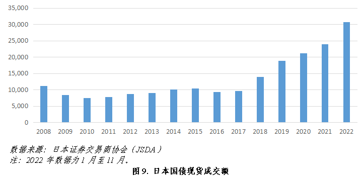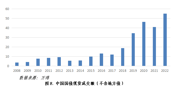 中日国债市场成交额都在稳步增加。近五年来,中国国债现货年度成交额增长五倍,2022年达到55万亿元人民币(约合8.2万亿美元)。