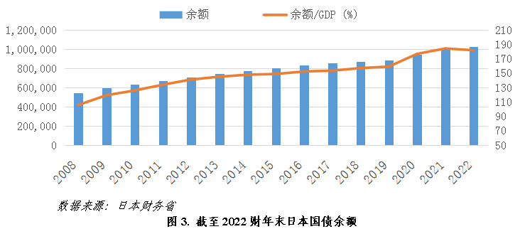 日本国债(JGB)的发行始于1966年,为覆盖不断攀升的财政赤字,日本国债余额持续增加,截至2022年末已超过1,000万亿日元(约合8万亿美元)。