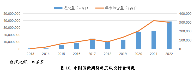 成交量方面,随着中国国债现货市场规模的快速增长、机构投资者类型不断丰富,中国国债期货市场也在稳步发展。10年期中国国债期货约占全部国债期货成交量的一半,2年期和5年期约占全部成交量的两成和三成。2022年,中国国债期货日均成交额约为1,918亿元人民币(约合28.4亿美元)。