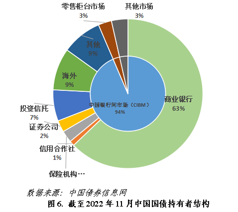 中国国债的利率水平略高于日本、德国等国家,对偏好高收益率的投资者具有较大吸引力,这或许是2019年以来境外投资者的中国国债持有量接近翻番的原因之一。 市场结构方面,与美国类似,中日两国国债现货均主要通过场外市场(非交易所)交易。根据中国银行间市场数据,如下图所示,国内商业银行持有约63%的中国国债。截至2022年11月,境外机构持有中国国债占比为9.1%。