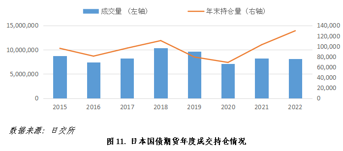 日本国债期货约99.9%的成交量来自10年期日本国债期货,2022年日均成交额约为10万亿日元(约合760亿美元)。在超低波动环境下,为拓展市场生态系统,日交所着力吸引海外投资者参与,10年期日本国债期货约70%的成交量来自海外投资者,剩余30%主要为银行和经纪商。