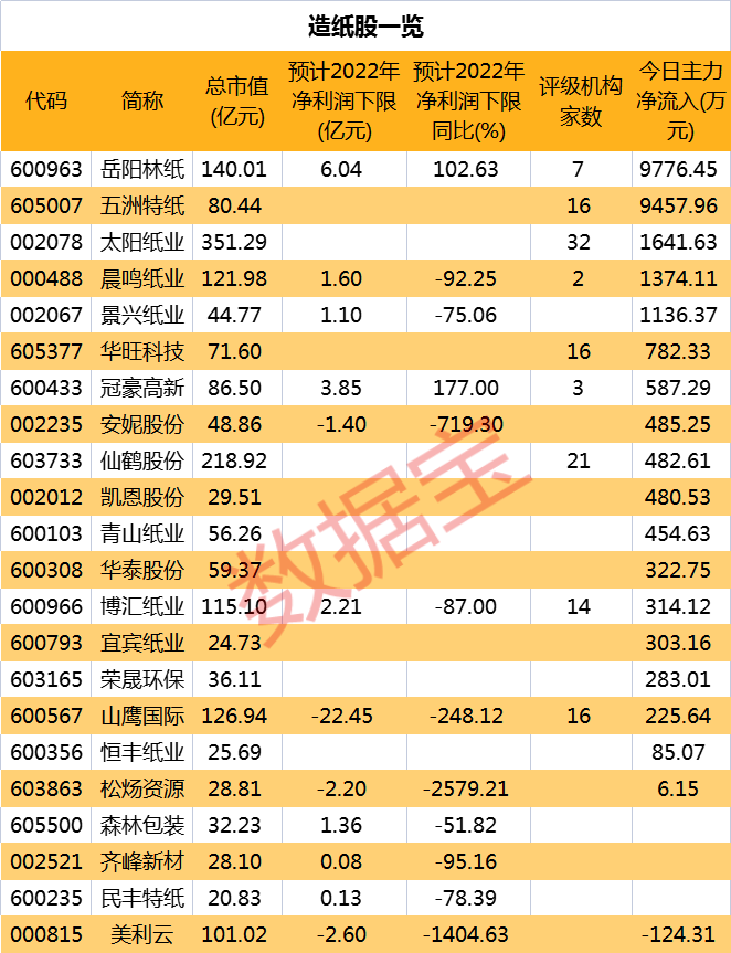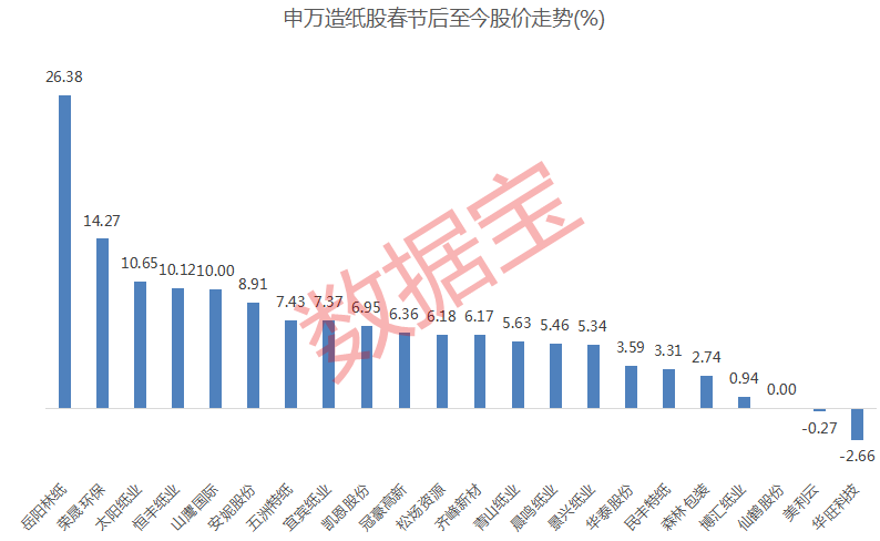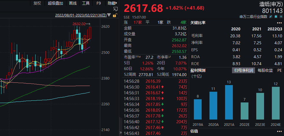 产品提价利好,五洲特纸今日涨停。 2月21日,五洲特纸发布提价函,决定2023年3月5日发货起,数码纸销售价格在目前定价基础上上调1000元/吨。 同日,河南江河纸业发布调价通知。公司表示,受生产运营成本上涨影响,自2023年3月5日发货起,数码纸全系产品在现有价格基础上统一上调1000元/吨。 冠豪高新也发布通知函,受原材料价格高位震荡影响,生产运营成本持续上升,经审慎研究决定,从2023年3月5日起,在现有价格基础上,热升华转印纸全系列产品价格统一上调1000元/吨。 申万造纸指数逆市上涨 受益于产品提价预期,2月22日,造纸指数逆市收涨1.62%。成份股中,五洲特纸午后涨停;其后岳阳林纸和仙鹤股份涨逾5%;凯恩股份、荣晟环保、宜宾纸业、冠豪高新等多股跟涨。 ![]() 将时间线拉长,春节后至今,造纸指数累计上涨7.48%。概念股中,岳阳林纸涨幅居首,为26.38%;荣晟环保、太阳纸业、恒丰纸业、山鹰国际等多股涨逾10%。仅美利云与华旺科技两股股价下跌,幅度均不足3%。 ![]() 多家机构看好造纸业盈利修复 东吴证券表示,春节后复工复产复学速度加快,大宗纸开启提价,看好需求的底部反转。与此同时,针叶浆外盘报价维持稳定,智利Arauco等国际大厂扩产产能预计今年一季度末陆续到港,缓解全球纸浆供应紧缺,叠加海运费用回落,成本下行,看好纸企盈利能力释放。 信达证券指出,在全球木浆供求格局变化的背景下,浆系纸企成本改善确定性仍然较高。随着年后消费转暖,浆系纸企陆续发布涨价函,持续看好龙头纸企吨盈利逐季改善趋势。 海通证券认为,从成本端看,进口木浆、木片价格在2023年或继续下行,叠加汇率变动,纸企成本有望逐步回落,随着低价进口木浆陆续到港,在二季度成本或迎来明显下降。 从纸价看,2023年国内下游需求复苏或驱动上半年纸价上行。若成本改善和纸价提升同时实现,造纸行业盈利在2023年上半年有望明显修复。 两股全年业绩预增 这些公司获机构高关注 证券时报·数据宝统计,截至2月22日,A股市场22家造纸上市公司中,12家发布业绩预告。预增公司仅有两家,为岳阳林纸和冠豪高新,净利润同比增幅下限依次为102.63%、177%。其余公司预告类型为预减、首亏或续亏,分别有6家、3家和1家。 岳阳林纸预计2022年净利润6.04亿元至6.44亿元,同比增长102.63%至116.05%;扣非净利润同比增长179.01%至198.05%。天风证券表示,公司浆纸业务稳健,集采、长协、自产浆比重超50%,成本端优势突出,长期看林业碳汇前景广阔。 特种纸龙头冠豪高新预计2022年净利润为3.85亿元,同比增长177%;扣非净利润增长544.38倍,主要系报告期内公司合并粤华包B,以及上期计提大额减值损失所致。 华西证券对公司前景表示看好。短期看,下游需求回升叠加成本下行,利好业绩进一步提升;中长期看,特种纸和白卡纸业务均将受益于产能扩张以及在优质客户供应体系内的份额提升。 ![]() 机构关注度方面,太阳纸业获得最多机构关注,共计32家公司参与评级;仙鹤股份次之,参评机构有21家。此外,五洲特纸、华旺科技、山鹰国际、博汇纸业等股近期获得15家左右机构评级覆盖。 今日,多只造纸股获得主力资金注入。以绝对量看,岳阳林纸净流入额居首,为9776.45万元,该股大涨8.53%。五洲特纸主力净流入9457.96万元,个股涨停,收盘时有2.35万手封单。另有太阳纸业、晨鸣纸业、景兴纸业等3股主力净流入超1000万元。 (文章来源:数据宝) (责任编辑:admin) |