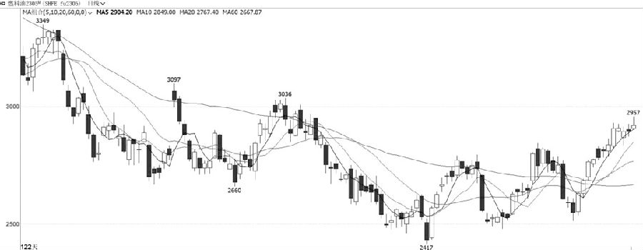 沪银2306合约近期跌至4870点一线后逐步企稳反弹,价格向上突破10日均线压力。量能方面,价格反弹过程中成交量变化不大,持仓量小幅下滑。指标方面,短期均线走势偏弱,60日均线处于水平走势,MACD指标快慢线在零轴下方有望交出金叉。综合来看,沪银2306合约近期出现止跌反弹,一旦MACD指标交出金叉,可以进行偏多思路操作。 燃料油 阶段新高