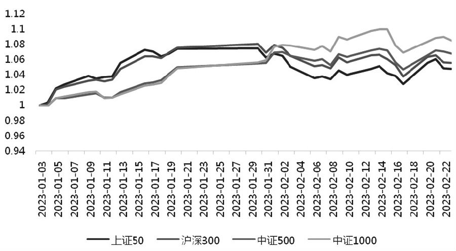 图为两融余额(亿元) 从多年的历史数据看,A股市场春季“日历效应”明显。目前A股市场高位振荡,经历了1月份的上涨后缺乏明显的交易主线。不过,近期市场情绪相对稳定,两融余额逐步上升,期权隐波维持低位振荡,指数出现大幅调整的可能性较低。在政策效应影响下,结构性行情将更为突出,大盘风格有望回归。 春季“日历效应” 从2010—2022年的历史数据看,A股市场春季“日历效应”较为明显。 其一,指数在春节后上涨概率较高。A股市场春季行情的主要驱动为流动性偏宽松和政策预期。在政策与业绩真空期,市场对于新政策的预期有助于推动市场上行。随着政策表态逐步清晰,经济工作重心和政策方向基本确立,A股市场进入对政策目标的消化与纠偏阶段,但该阶段市场大多会因政策兑现不及预期出现短期振荡行情,指数通常表现为调整与行业轮动特征,各宽基指数上涨概率有所下降。政策效应后期,市场主线逐步明晰,市场风险偏好集中释放,指数会在短期形成较好的上涨行情,主要宽基指数大概率出现上涨趋势。 其二,指数分化明显,春季小盘风格整体占优。春节后,无论是从历年的上涨概率,还是平均收益上看,代表中小盘的中证1000、中证500指数均较上证50、沪深300指数表现更加强势,中证1000相对中证500表现更优。尤其是在2007、2015年牛市期间,中小盘分化较大,仅有2016年春节后,市场快速下跌,风险偏好下降,IC表现弱于IH和IF。 政策效应后期,小盘风格优势逐渐消退。究其原因,风格分化的背景在于春季的“数据真空”和“政策期许”,市场往往对稳增长政策和产业政策抱有一定的预期,融资资金较活跃,使得市场风格多偏向成长性与题材性更好的中小盘股。但随着稳增长政策逐渐落地,传统基建链以及地产链等稳增长板块上涨概率更高且平均收益也相对较高,小盘风格的优势削弱,大盘价值和大盘成长开始阶段性占优。 行情回顾 2023年1月,股指市场整体回暖,上证综指单月涨幅逾7%,其他股指品种亦同步上涨。利多因素主要包括:一是国内疫情防控政策优化后,随着多地病例逐步过峰,疫情影响逐渐减弱,市场开始为后续消费恢复带动经济复苏计价;二是外资热情高涨,北向资金呈现大幅净流入状态并不断创纪录,瑞士联合银行集团、摩根士丹利、野村投资管理、高盛、JP摩根等知名外资对A股上市公司展开积极调研。