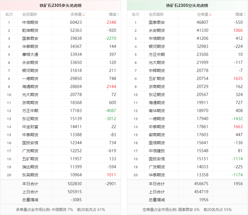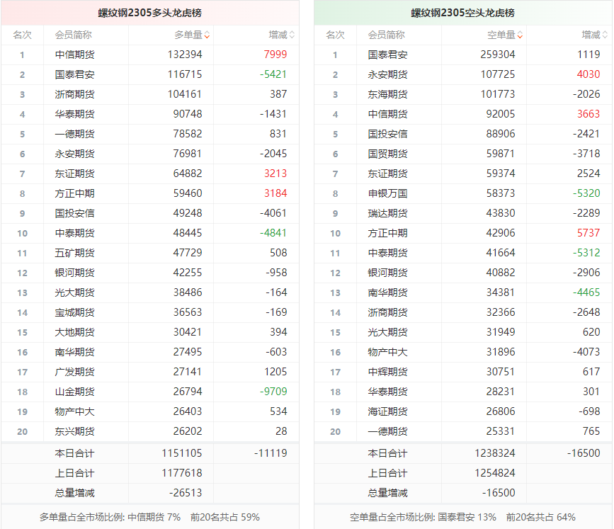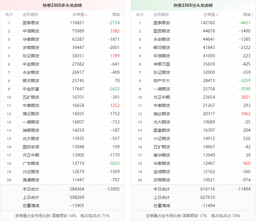 截至2月28日收盘,螺纹钢2305收4174/吨,跌0.41%;热卷2305收4260/吨,跌0.40%;铁矿石2305收888.5元/吨,涨0.34%;焦炭2305收2901.5/吨,跌1.24%;焦煤2305收2013.5元/吨,跌2.45%。 螺纹钢2305合约前20席位多单减仓11119手至115.1万余手,空单减仓16500手至123.8万余手。其中,中信期货多单增持7999手,空单增持3663手,整体呈净多40389手。 各品种具体如下: ![]() (来源:东方财富期货PC端) 各品种持仓情况具体如下: ![]() ![]() ![]() ![]() ![]() 注:可通过点击东方财富期货PC端左侧“龙虎榜”栏目查看各类机构持仓及盈亏榜单信息。 ![]() (文章来源:东方财富研究中心) (责任编辑:admin) |
