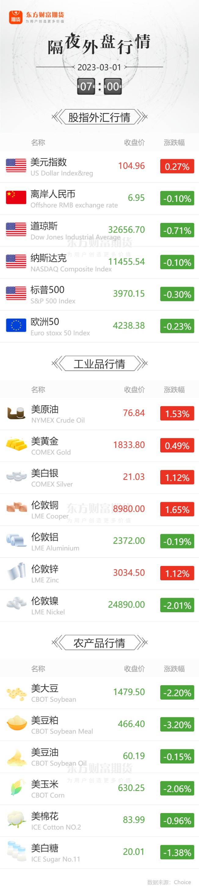 外盘收报![]() 每日精选中国共产党第二十届中央委员会第二次全体会议公报 中信证券首席经济学家明明:权益资产处低估值区间 贵金属避险价值值得关注 现货“有价无市” 企业套保兴趣增强 花生价格拐点来了? 俄能源公司:预计2023年油市高度波动 价格将在80至110美元之间 大宗商品交易员注意!印度2月刷新百年高温纪录 背后危机四伏 宏观产经新华社:中国共产党第二十届中央委员会第二次全体会议,于2023年2月26日至28日在北京举行。全会由中央政治局主持。中央委员会总书记习近平作了重要讲话。 国家统计局:初步核算,2022年全年国内生产总值1210207亿元,比上年增长3.0%。全年全国居民人均可支配收入36883元,比上年增长5.0%,扣除价格因素,实际增长2.9%。全国居民人均可支配收入中位数31370元,增长4.7%。低收入组人均可支配收入8601元,中间收入组人均可支配收入30598元,高收入组人均可支配收入90116元。 中国期货业协会:以单边计算,2月全国期货交易市场成交量为540,870,330手,成交额为409,569.52亿元,同比分别增长26.69%和16.88%,环比分别增长35.89%和36.36%。1-2月全国期货市场累计成交量为938,890,457手,累计成交额为709,918.55亿元,同比分别增长7.91%和下降0.97%。 品种资讯黑色系&有色系期货 铁矿石:中国45港进口铁矿石库存总量14074.57万吨,环比上周一减少173万吨,47港库存总量14706.57万吨,环比减少236万吨。 螺纹钢:2月28日,全国174家长、短流程代表钢厂废钢库存总量409.95万吨,较昨日增4.64万吨,增1.14%;库存周转天10.6天,较昨日增0.1天;日消耗总量34.15万吨,较昨日增4.59%;日到货总量38.79万吨,较昨日增5.69%。(Mysteel) 2022年我国粗钢产量101795.9万吨,同比降1.7%;钢材产量134033.5万吨,同比增0.3%。(国家统计局) 煤炭:根据有关工作安排,国家发改委运行局负责同志带队,于2月8日至10日赴贵州省开展现场调研,与贵州省能源保供有关部门、地市和能源企业召开2次座谈会,赴南网贵州公司、黔西电厂、大方电厂、红林煤矿实地察看电力煤炭生产供应情况,充分听取地方和重点能源企业关于保供的意见建议,分析研判贵州省电力供需形势,保障能源电力安全稳定供应。(发改委) 国际能源署日前表示,到2027年,太阳能发电有望超过燃煤发电,成为主要的发电方式。一个重要的原因就是太阳能电力的安装成本大幅下降。数据显示,对于公用事业规模的太阳能,其建设和运营的平均成本自2009年以来持续下降,到2021年大约仅为每兆瓦时36美元,与09年相比下降了大约90%。 (央视财经) 随着工业用电的恢复,电厂日耗攀升至高位,采购以长协为主,各方观望情绪较浓,船东信心有所增加,报价坚挺,沿海煤炭运价持续上涨。 (上海航运交易所) 有色金属:伦敦金属交易所(LME)宣布立即暂停任何新的原铝、铜、铅、镍或铝合金的LME注册仓单,该规定适用于存储在美国的LME上市仓库。 (财联社) 铜:智利统计局数据显示,智利1月铜产量为435,939吨,环比减少12.46%,同比增加1.3%。(财联社) 农产品期货 生猪:海关总署、农业农村部近日发布关于防止新加坡非洲猪瘟传入我国的公告,其中提到,禁止直接或间接从新加坡输入猪、野猪及其产品,停止签发从新加坡输入猪、野猪及其产品的《进境动植物检疫许可证》,撤销已经签发在有效期内的《进境动植物检疫许可证》。(财联社) 据农业农村部监测,截至2月28日14:00时,全国农产品批发市场猪肉平均价格为20.97元/公斤,较前一日上升1.2%;鸡蛋平均价格为10.21元/公斤,较前一日上升0.3%。 (新华财经) 大豆:农业农村部办公厅主任魏百刚今日在国务院政策例行吹风会上表示,今年我们将进一步加大工作力度,持续抓好大豆和油料扩种,力争再扩种一千万亩以上,食用植物油自给率提高一个百分点。(证券时报) 2月上半月大豆进口实际装船同比下降22.79%。本期报告以进口商02月1日-15日的报告数据为基数。下期报告期为02月16日-28日。本期进口实际装船41.19万吨,同比下降22.79%;本月进口预报装船49.54万吨,同比下降93.92%;下月进口预报装船34.44万吨,同比下降96.56%。(商务部对外贸易司) 棕榈油:2月上半月棕榈油进口实际装船同比上升1117.80%。本期报告以进口商02月1日-15日的报告数据为基数。下期报告期为02月16日-28日。本期进口实际装船27.98万吨,同比上升1117.80%;本月进口预报装船30.74万吨,同比上升216.84%;下月进口预报装船1.50万吨,同比下降89.90%。(商务部对外贸易司) 印尼将3月1日至15日毛棕榈油参考价格定在889.77美元/吨。(财联社) 马来西亚2月1-28日棕榈油出口量为1062057吨,上月同期为1066287吨,环比减少0.4%。(马来西亚独立检验机构AmSpec) 马来西亚2月1-28日棕榈油出口量为1159720吨,上月同期为1133868吨,环比增加2.28%。(船运调查机构ITS) 花生:上海市一家投资机构人士表示,虽然近期青岛港等进口苏丹花生米报出了10800元/吨甚至更高的价格,但市场实际上呈现出一种有价无市的局面,高企的花生米很有有人愿意承接。据了解,目前大中型油厂并不缺原料,花生成品库存更是累积较为严重,山东省某地一家油厂高位采购数百吨原料,大概率是生产应急所用。 (期货日报) 能化期货 原油:俄罗斯天然气工业石油公司总经理亚历山大久科夫预计,2023年全球石油市场的波动性将相对较高,其价格将在80至110美元之间波动。(财联社) 水泥:春节过后,水泥行情逐渐回暖。近期,广东、云南、安徽、上海等地水泥价格上扬,水