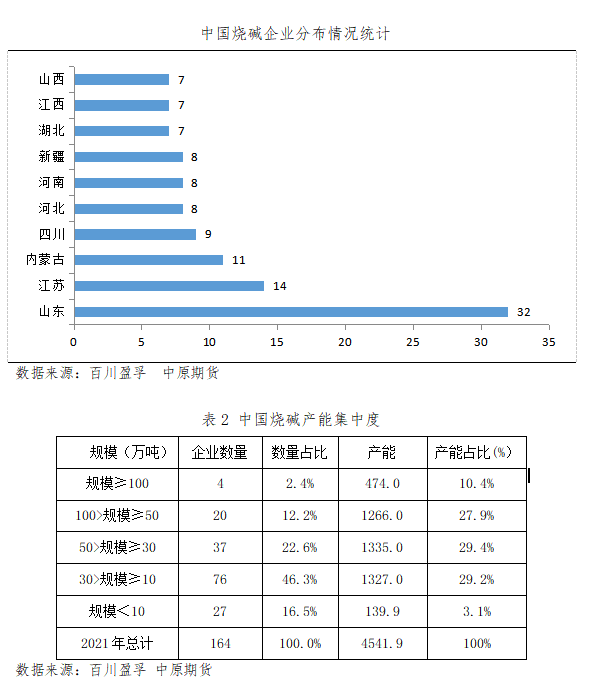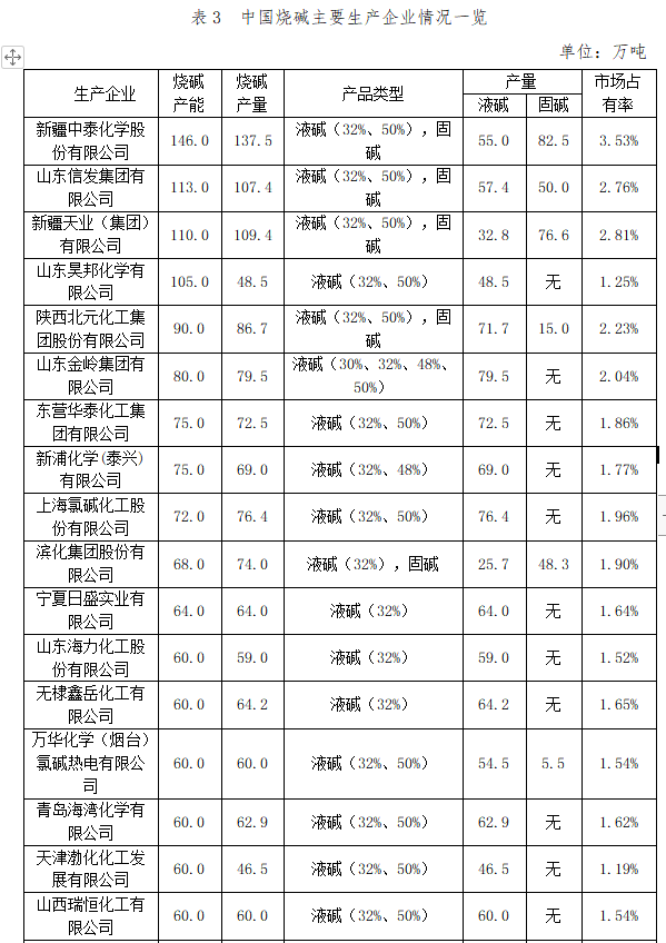 具体到企业而言,2021年中国烧碱生产企业共164家,分布于全国28个省(市、自治区)。山东、江苏和内蒙古辖区企业数量均超过10个,其中,山东省以32家烧碱企业的体量一骑绝尘。而从产能集中度上来看,产能在100万吨以上的企业仅4家,企业数量占比为2.4%,产能占比10.4%,行业集中度不高。企业生产情况如表3所示。