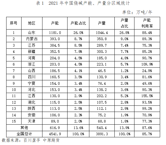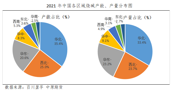 中国烧碱产能及产量区域分布与多数工业品无异,即主要有两大特点,靠近原料产地或靠近消费地。截至2021年底,中国烧碱产能4541.9万吨,产量3891.3万吨,产能利用率85.7%。 (1)产能、产量区域分布 2021年烧碱装置产能和产量分布最多的是华北地区,全国占比分别达35.4%、33.4%;排名二、三的是西北和华东地区。 上述地区中,华北、华东地区同属产销集中地,烧碱下游需求旺盛。其中,华北地区下游氧化铝行业较集中,华东地区下游纺织印染、造纸行业等比较发达。西北地区则凭着丰富的原盐、煤炭等资源获得了显著的生产成本优势,叠加人力成本优势,引致近年来新增产能较多,但该地区烧碱下游需求严重不足,因此一般生产固碱外运至西南、华东、华南等地区。