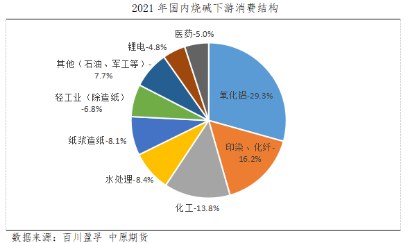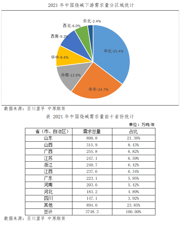 (2)消费结构及区域差异 国内烧碱下游需求领域中,氧化铝行业占比最大,历史上对烧碱的消费占比基本稳定在3成左右,2021年对烧碱的需求量为1099.3万吨,占比29.3%;其次是印染化纤、化工、水处理、造纸(纸浆)、轻工业(除造纸)、医药、锂电等行业。