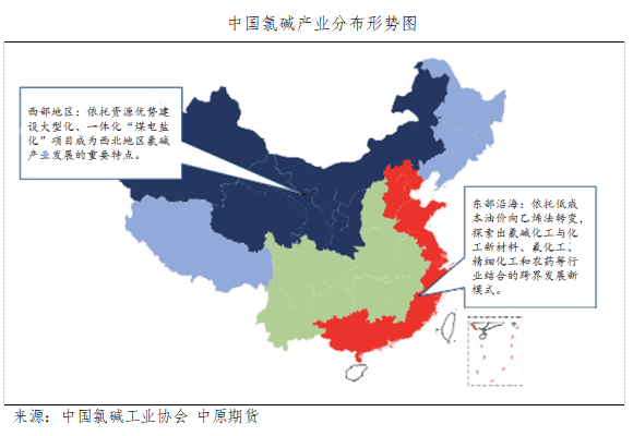 事实上,不仅烧碱,PVC的产能分布也主要集中在内蒙古、新疆和山东、陕西等地,从而,整个氯碱行业的布局基本呈现以东部沿海和西北地区为主的两极格局。事实上,这主要是资源禀赋及区位特点所致,西北地区的煤炭、电石等氯碱原料成本优势明显,而东部沿海地区则是依托港口获得了极佳的进口优势(乙烯法及单体法等),且是氯碱产品主要消费市场,不同成长路径和发展特点的氯碱产业带相对清晰。