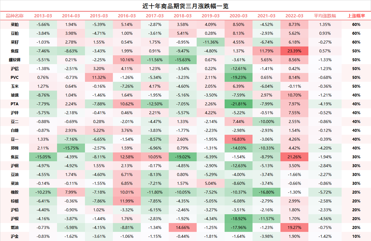 品种季节性规律总结——近十年商品期货三月涨跌幅一览!