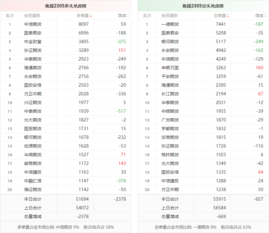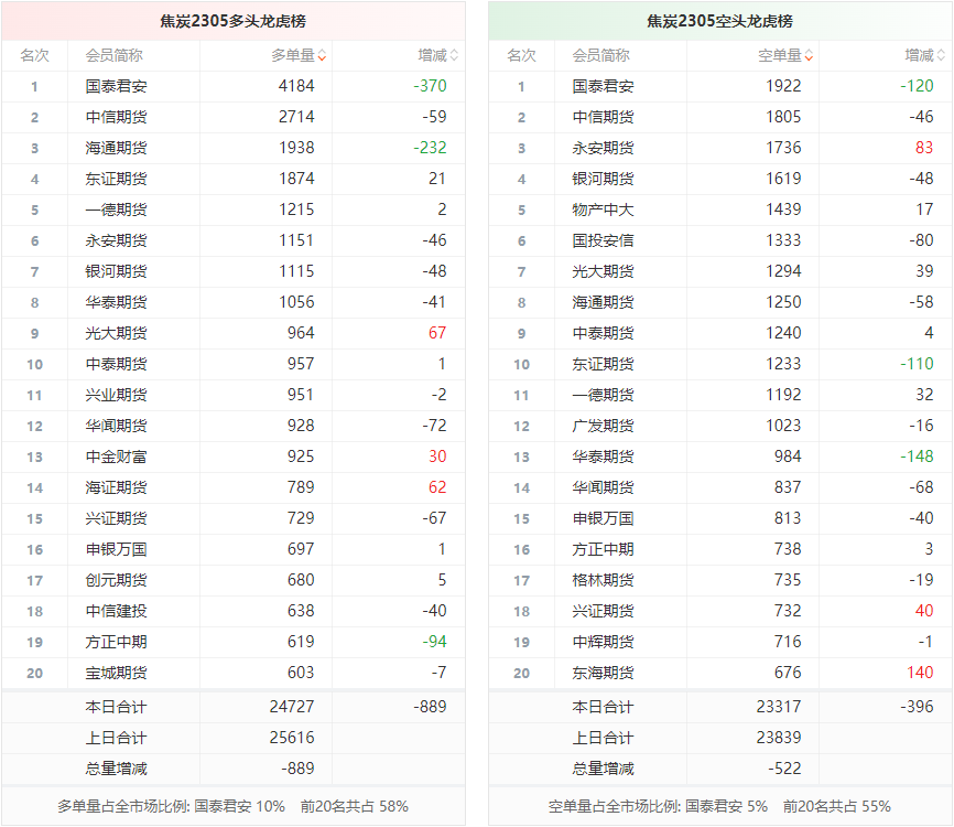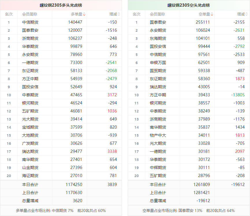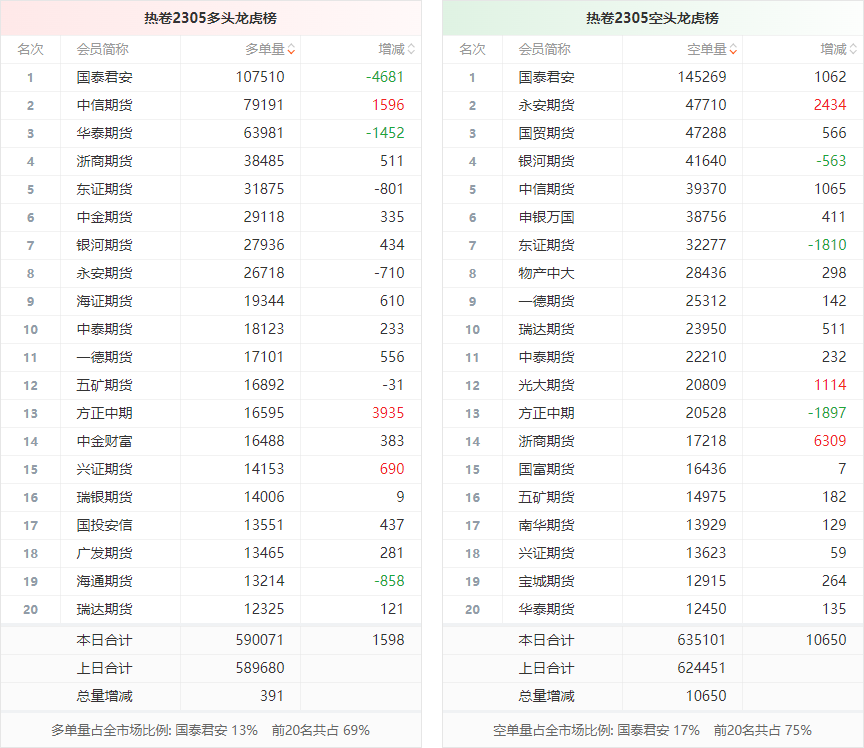截至3月2日收盘,螺纹钢2305收4225/吨,涨0.64%%;热卷2305收4320/吨,涨0.77%%;铁矿石2305收912.5元/吨,涨1.56%;焦炭2305收2954.5/吨,涨0.63%;焦煤2305收2018元/吨,跌0.44%。 螺纹钢2305合约前20席位多单增仓3839手至117.4万余手,空单减仓19612手至126.1万余手。其中,方正中期期货多单减持2479手,空单减持13805手,整体呈净多15506手。 各品种具体如下: ![]() (来源:东方财富期货PC端) 各品种持仓情况具体如下: ![]() ![]() ![]() ![]() ![]() (文章来源:东方财富研究中心) (责任编辑:admin) |