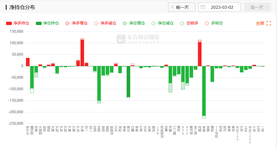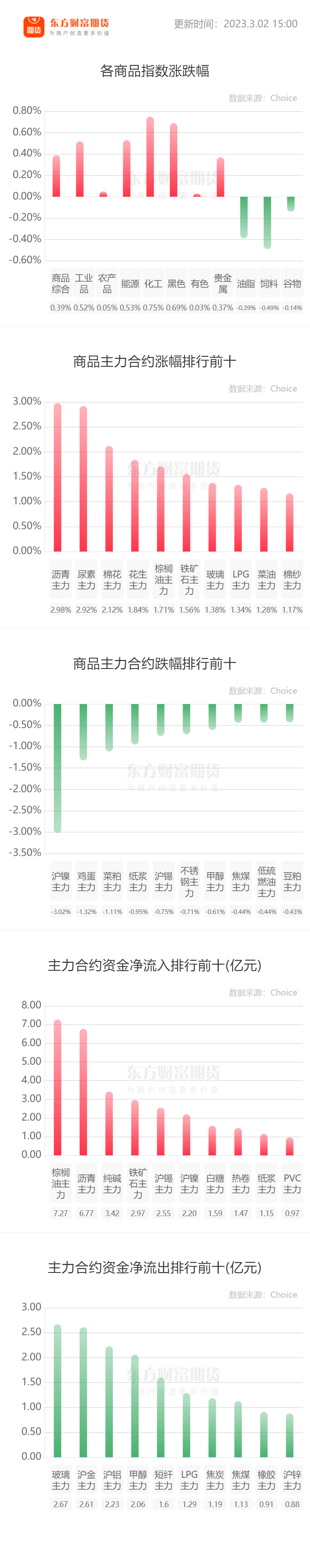 一、行情纵览 二、宏观要闻 【楼市地产】楼市回暖的信号已经越来越明确。数据上看,北京、上海、深圳、广州、成都等部分热点城市的最新二手房成交甚至可以用“火爆”形容。易居研究院数据显示,今年2月,北京全市二手住宅成交套数超过1.4万套,环比增长超过70%。上海全市成交1.7万套,环比增长111%。广州、成都、深圳、杭州等地二手住宅成交也大幅回暖,环比增速均超过80%。(券商中国) 【货币政策】尽管美联储自去年以来已经采取了最为激进的货币紧缩政策,但美国通胀率距离央行目标水平仍相去甚远。当地时间周三(1日),美联储官员们再度“放鹰”称,利率将需要进一步提高,并在明年保持在高位,以遏制通胀。(财联社) 【地产政策】广东省人民政府印发2023年广东金融支持经济高质量发展行动方案,其中提出,支持房地产市场平稳健康发展。因城施策实施好差别化住房信贷政策,合理确定商业性个人住房贷款的最低首付款比例、最低贷款利率要求,支持居民刚性和改善性住房需求。用足用好“保交楼”专项借款、“保交楼”贷款支持计划等政策工具,保持开发贷款和债券融资稳定,加快开展保函置换预售监管资金业务,满足项目合理融资需求。支持信托公司、金融资产管理公司依法合规参与房地产项目并购重组。鼓励金融机构重点支持治理完善、聚焦主业、资质良好的房地产企业稳健发展,支持优质房企与金融机构自主协商存量融资展期,利用资本市场并购重组和开展股权融资,为优质房企发行债务融资工具提供增信支持。鼓励金融机构优化建筑企业信贷服务,提供必要的贷款支持,保持建筑企业融资连续稳定。做好重点房地产企业风险处置项目并购的金融支持和服务工作,对并购出险和困难房地产企业项目的并购贷款暂不纳入房地产贷款集中度管理。(财联社) 三、品种资讯 【农副类】 生猪: 傲农生物2月出栏量再次突破50万头关口。财联社记者从傲农生物处获悉,2月出栏结构中仔猪占比近一半,公司未来生产节奏正逐步放缓。(财联社) 牧原股份3月2日在投资者互动平台表示,公司将持续采取多种措施降低原粮价格上涨的影响,降低采购成本;同时会持续做好生猪健康管理、疫病净化,在营养配方和智能化设备方面加大研发投入,并将加大精细化管理力度,使得养殖成绩进一步提升,生产效率进一步提高,养殖成本持续降低。(每日经济新闻) 鸡蛋:近期国内肉鸡市场走势强劲。据卓创资讯统计,受供应量低位,需求回升及成本高位上涨支撑,毛鸡价格持续上涨至近年高位。1-2月毛鸡均价为4.43元/斤,环比涨幅15.97%,并在2月下旬突破“5元”大关。同时,2023年1-2月,在供需双重利多作用下,国内白羽肉鸡苗价格涨至近三年新高。期间鸡苗价由1.35元/羽涨至5.43元/羽,累计涨幅302.22%。(证券时报·e公司) 小麦:印度媒体2月28日报道,印度气象局当天表示,印度今年2月份的全国平均最高气温达到29.54摄氏度,达到1901年有记录以来的同期最高水平。报道指出,长时间的持续高温可能会对印度小麦产量造成影响。(界面新闻) 【能化类】 原油: 本计价周期内(2月18日0时到3月3日24时),原油变化率在负值范围内持续收窄。截至今日(3月2日),距离调价窗口开启仅剩1个工作日,本轮成品油零售限价调整搁浅概率较大。(新华财经) 3月2日,据彭博消息,美国国务院高级官员周三告诉记者,拜登政府将继续与印方官员探讨印度购买俄罗斯石油之事,但迄今对新德里购买的原油远低于西方设定的价格上限感到满意。(界面新闻) 沙特阿美石油首席执行官表示,预计全球主要消费市场的原油需求都将“非常强劲”。(财联社) 天然气:石油及天然气管道公司安桥称,美国液化天然气出口量在2050年将达到每日280亿立方英尺。(财联社) 乙二醇:截至3月2日,华东主港地区MEG港口库存总量106.98万吨,较上一统计周期增加3.66万吨。近期主港到货稳定但聚酯原料宽裕之下提货减弱,库存止跌回升。(隆众资讯) 橡胶:今年以来,随着轮胎产业链整体转暖,相关企业借资本市场再融资动作频繁。数据显示,截至2月28日,A股轮胎产业链的45家公司中,已有约10家公司披露或更新了再融资事项。(证券日报) 【金属类】 钢材: 据Mysteel,截至3月2日当周,螺纹产量、表观消费连续五周增加,社库结束连续十三周增加的势头,厂库连续两周减少。①螺纹产量295.03万吨,较上周增加12.86万吨,增幅4.56%;②螺纹厂库327.92万吨,较上周减少9.38万吨,降幅2.78%;③螺纹社库910.96万吨,较上周减少4.98万吨,降幅0.54%;④螺纹表需309.39万吨,较上周增加15.71万吨,增幅5.35%。(Mysteel) 近日,国家发展改革委产业司负责同志赴中国钢铁工业协会参加工作会商。工业和信息化部原材料司、生态环境部大气司、商务部对外贸易司和世界贸易组织司等有关部门司局共同参加此次会商。与会各部门、单位聚焦深化钢铁供给侧结构性改革、推动钢铁产业高质量发展主题,重点围绕当前钢铁行业有关重大问题进行了深入交流,并研究了2023年重点工作任务。(国家发改委) 一位从事贸易的业内人士向财联社表示,当前由于防疫已完全放开,对于宏观经济的预期开始向好,同时房地产政策已现底,不少“大鳄”有开始重返地产的迹象。从数据上来看,二月份地产的成交量也有不错的改善,虽然扣除季节因素的影响,但从现场的认购人数来看还是超出此前预期的。(财联社) 河南钢铁