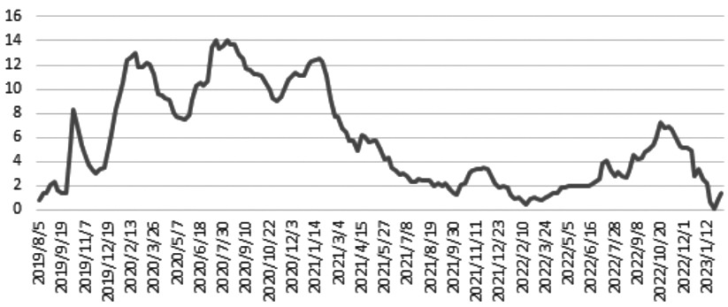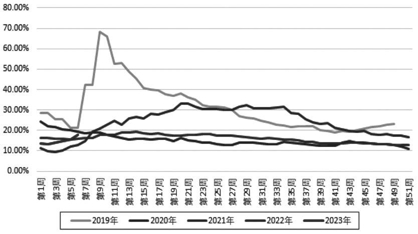 图为175公斤肥猪与标猪价差(单位:元/公斤) 截至3月1日,生猪期货2303合约报收17160元/吨,期现基差-1140元/吨,全国商品猪出栏均价16.02元/公斤,较1月底的13.89元/公斤增加2.13元/公斤,涨幅13.89%。当前市场供需延续僵持状态,供给方面,北方散户整体存栏较少,对低价认可度不高,出栏积极性一般,且月初养殖公司出栏积极性也不高;需求方面,随着价格上涨、需求低迷,屠企屠宰量小幅下滑。 二次育肥对猪价的影响增大 近期,二次育肥(下称二育)对猪价的影响逐渐增加。一方面,近几年受猪价的高幅波动影响,二育群体不断扩大。当前二育群体不再局限于散户及调运商,更多的是中型规模场及外购育肥户。比如外购仔猪的企业除了外购仔猪育肥,还会根据行情做短期二育。据了解,今年做二育的群体不低于去年,猪价的高波动吸引更多的养殖户加入二育。另一方面,二育的期限灵活度逐渐提升。养殖户根据对猪价的预期,做二育的周期短到1周,长至2—3个月。 春节后猪病疫情有所缓解,猪价也开始不断提升。在买涨不买跌心里预期下,一定程度的猪价上涨不但阻止不了二育补栏的热情,反而会助推补栏情绪,二育的询盘和采购积极性不断提升。此外,标肥价差方面,截至2月23日当周,175公斤肥猪与标猪的价差由之前的-0.2元/公斤左右缩小至-0.01元/公斤。春节后虽然肥猪需求不畅,但标肥价差的缩小也侧面验证了市场可供应大猪不多,这也是支撑二育进场的原因之一。 2月下旬,全国生猪均价最高逼近16元/公斤,增加了二育成本,高于养殖户心理预期,导致二育进场积极性受限,部分二育群体开始观望,预计短期二育进场速度减缓。但业内人士普遍认为,二育市场热情仍未消退,随着收储消息的公布,价格回落至养殖户预期价位,二育积极性会再度提升。建议投资者持续关注二育的补栏及出栏时间。 仔猪价格持续上涨 近期仔猪报价继续上涨。截至2月23日当周,15公斤仔猪周度出栏均价为647元/头,周环比上涨8.92%;较2月初的513元/头累计上涨135元/头,涨幅26.32%。 春节后仔猪价格整体上行的主要原因为:其一,仔猪供给减少。部分地区保温措施较差,受冬季寒冷天气影响,仔猪流行性腹泻增加,一定程度上导致仔猪成活率降低。其二,冬季猪病频发,部分猪源被迫提前出栏,透支了可出栏猪源,养殖户又比较看好后市行情,补栏增多。其三,多数从业者认为猪价已跌至谷底,后续行情较为乐观,补栏热情高涨。 据了解,当前仔猪市场询价增多,虽然企业实际外销量较少,但情绪支撑较强,预计短期内仔猪成交将继续提升,报价仍有上行空间。 鲜销需求依旧低迷 春节后白条消费复苏缓慢,走货一般,屠企屠宰量同比有所增加,但鲜销率却不增反降。相关数据显示,2023年春节后至今屠宰鲜销率比去年同期下降6个百分点。