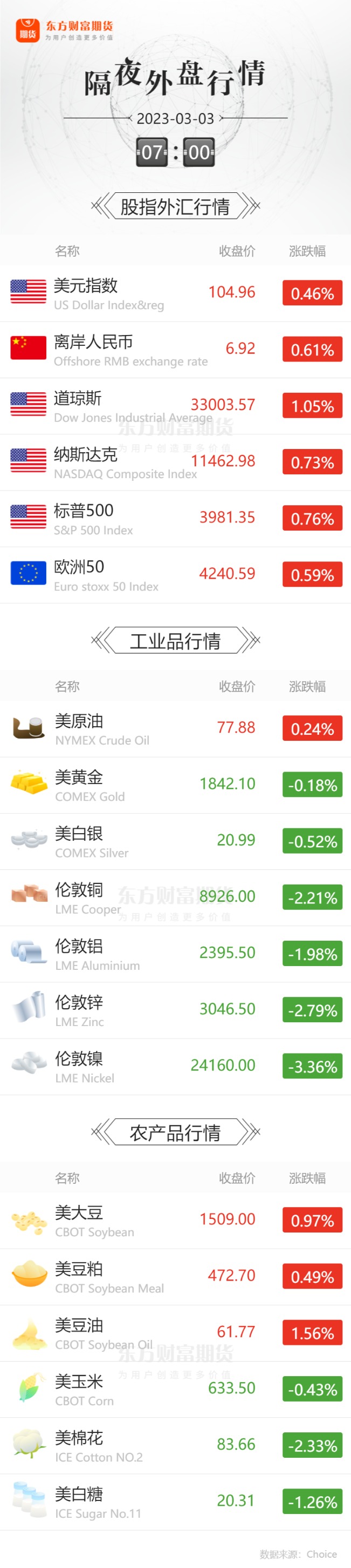 外盘收报![]() 每日精选2月百城房价结束“七连跌” 今年各地出台稳楼市政策已超百条 品种季节性规律总结——近十年商品期货三月涨跌幅一览! 第一家高喊美联储3月加息50基点的投行出现了! 宏观产经财联社:中指院数据显示,2月百城新建住宅均价16174元/平方米,环比持平,同比下跌0.06%;二手住宅均价15856元/平米,环比下跌0.01%,同比下跌0.96%。“可以看出,2月百城新房价格结束了自2022年7月以来的‘七连跌’,二手房价格环比跌幅也明显收窄。”中指院指数事业部研究副总监徐跃进表示。 中国银行:促进大宗商品领域计价结算和融资发展。在新加坡、伦敦等全球大宗商品贸易中心,推动央企、国企、大宗商品贸易、工程承包等企业上游使用人民币计价结算和融资,全力服务好大型能源公司的人民币业务。 财联社:美国上周首次申领失业救济人数为19万人,预估为19.5万人,前值19.2万人。美国至2月18日当周续请失业金人数 165.5万人,预期166.5万人,前值165.4万人。 品种资讯黑色系&有色系期货 螺纹钢:近日,国家发展改革委产业司负责同志赴中国钢铁工业协会参加工作会商。工业和信息化部原材料司、生态环境部大气司、商务部对外贸易司和世界贸易组织司等有关部门司局共同参加此次会商。与会各部门、单位聚焦深化钢铁供给侧结构性改革、推动钢铁产业高质量发展主题,重点围绕当前钢铁行业有关重大问题进行了深入交流,并研究了2023年重点工作任务。(国家发改委) 本周,钢材总库存量2319.93万吨,环比降35.63万吨。其中,钢厂库存量667.61万吨,环比降18.53万吨;社会库存量1652.32万吨,环比降17.10万吨。(Mysteel) 中国钢铁工业协会组织召开电炉炼钢发展专项研讨会。钢协副会长骆铁军在总结讲话中强调,开展电炉炼钢发展专题研究非常重要,要加快研究工作。在研究工作中把握好“三个原则”:一是市场化、科学化原则;二是突出重点,定方针大略,重点搞清长短流程在低碳发展中的定位和关系;三是巩固钢铁去产能成果,严格控制无产能的新建电炉。最终,要提出具有指导性、可操作性的政策建议,切实指导钢铁行业绿色低碳和高质量发展。(中钢协) 河南钢铁集团宣告成立,河南省正式启动钢铁行业的区域性整合。3月1日,安阳钢铁集团发布消息称,根据河南省委、省政府部署,河南钢铁集团于当天注册成立,注册资本为200亿元。公告并未披露河南钢铁集团的股东构成。 (界面新闻) 煤炭:推进能源产业链碳减排,加快煤炭减量步伐,严格合理控制煤炭消费增量,压减煤炭消费存量,统筹协调有序推进重点用煤行业控煤减煤,优化天然气利用结构,保持石油消费处于合理区间。(宁夏回族自治区发改委) 有色金属:铝库存减少3275吨,铜库存增加1025吨,镍库存减少210吨,铅库存减少25吨,锡库存减少10吨,锌库存增加2525吨。 (伦敦金属交易所LME) 农产品期货 生猪:截至2日14:00时,全国农产品批发市场猪肉平均价格为21.08元/公斤,比昨天上升0.3%;鸡蛋10.22元/公斤,比昨天上升1.1%。(新华财经) 据农业农村部信息中心和山东卓创资讯联合监测,截至2月24日当周,16省(直辖市)瘦肉型白条猪肉出厂价格总指数的周平均值为每公斤19.87元,环比上涨6.1%,同比上涨22.5%,较上周扩大7.7个百分点。 (新华财经) 傲农生物(603363.SH)2月出栏量再次突破50万头关口。财联社记者从傲农生物处获悉,2月出栏结构中仔猪占比近一半,公司未来生产节奏正逐步放缓。(财联社) 大豆:截至2月23日当周,美国2022/2023年度大豆出口净销售为36.1万吨,前一周为54.5万吨;美国2022/2023年度对中国大豆净销售21.8万吨,前一周为17.6万吨;2023/2024年度对中国大豆净销售13.2万吨,前一周为0万吨。(新华财经) 鸡蛋:近期国内肉鸡市场走势强劲。据卓创资讯统计,受供应量低位,需求回升及成本高位上涨支撑,毛鸡价格持续上涨至近年高位。1-2月毛鸡均价为4.43元/斤,环比涨幅15.97%,并在2月下旬突破“5元”大关。同时,2023年1-2月,在供需双重利多作用下,国内白羽肉鸡苗价格涨至近三年新高。期间鸡苗价由1.35元/羽涨至5.43元/羽,累计涨幅302.22%。(证券时报·e公司) 据土耳其媒体当地时间3月2日报道,土耳其西部鸡蛋生产大省阿菲永省和代尼兹利省暴发禽流感疫情。截至目前,这两个省都有鸡蛋生产设施受到影响。据统计,目前土耳其已有约650万只家禽被扑杀。分析人士担忧,虽然此轮暴发的H5N8型禽流感传染给人类的可能性很低,但疫情会影响家禽业的生产,影响肉蛋供应,可能会进一步加剧土耳其高通胀。 (央视财经) 棉花:据中国棉花信息网,今日中国棉花价格指数(CC Index)为15412元/吨,较上个交易日增加31元/吨。(新华财经) 能化期货 原油:本计价周期内(2月18日0时到3月3日24时),原油变化率在负值范围内持续收窄。截至今日(3月2日),距离调价窗口开启仅剩1个工作日,本轮成品油零售限价调整搁浅概率较大。(新华财经) 燃油:截至3月1日当周,新加坡燃油库存为2060万桶,前一周为2260万桶;新加坡中馏分油库存为720万桶,前一周为820万桶;新加坡轻质蒸馏油库存为1710万桶,前一周为1560万桶。(新加坡企业发展局) 玻璃:本周下游加工企业接单一般,且回款多不理想,备货采购意向偏弱,浮法玻璃平均产销率整体仍难达平衡,库存趋势仍是累库为主。截止3月2日,全国浮法玻璃样本企业总库存8223.7万重箱,续刷2020年5月份以来新高,环比增加0.92%,同比增加60.8%,折库存天数较上期增