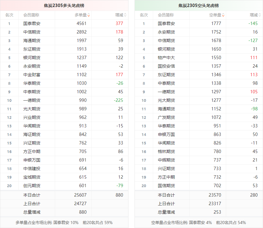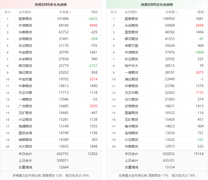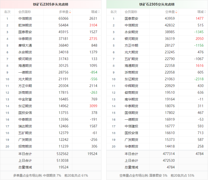 截至3月3日收盘,螺纹钢2305收4272/吨,涨1.26%;热卷2305收4371/吨,涨1.34%%;铁矿石2305收919元/吨,涨1.04%;焦炭2305收2967.5/吨,涨0.46%;焦煤2305收2004元/吨,跌1.01%。 螺纹钢2305合约前20席位多单增仓14286手至118.3万余手,空单增仓3720手至125.7万余手。其中,中信期货多单增持12319手,空单减持5089手,整体呈净多60294手。 各品种具体如下: ![]() (来源:东方财富期货PC端) 各品种持仓情况具体如下: ![]() ![]() ![]() ![]() ![]() (文章来源:东方财富研究中心) (责任编辑:admin) |