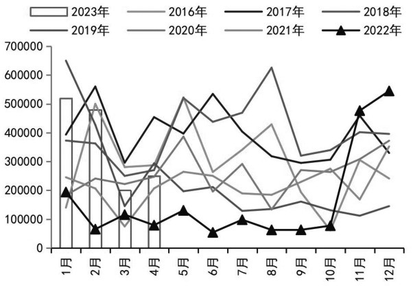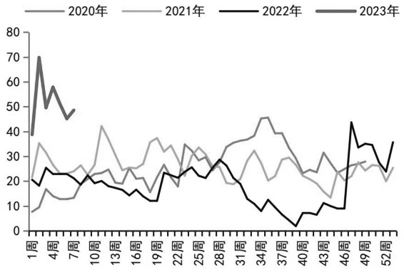 图为我国菜籽进口量(单位:吨) 近年来,我国菜籽进口仍集中于加拿大,而菜粕和菜油的进口来源地主要有加拿大、阿联酋、俄罗斯等国家。在欧盟、加拿大、俄罗斯、澳大利亚等油菜籽主产国(地区)增产的背景下,2022/2023年度全球菜籽供需趋向宽松。其中,加拿大菜籽产量预计在1850万吨左右,出口量将增加至880万吨。加拿大谷物协会发布的数据显示,截至2022/2023年度第28周,加拿大菜籽累计出口465万吨,同比增加近30%。然而,2022年10—12月,加拿大对我国菜籽出口量累计达163 万吨。中国粮油商务网公布的数据显示,预计2023年1—2月我国菜籽累计进口量将达100万吨。因此,在国外菜籽产量恢复和贸易正常的条件下,预计后期我国菜系供应将稳步增加。据统计,截至2023年第7周,我国油厂进口菜籽库存量为48.6万吨,环比增加7.52%,同比增加129.25%。在进口菜籽到港量较高的背景下,预计后期我国油厂菜籽压榨量也将处于高位,国内菜粕和菜油库存继续回升概率较大。