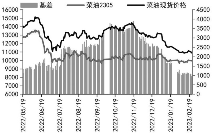 图为我国菜籽库存量(单位:万吨) 供需决定价格,价格结构往往也反映着供需变化。在国内菜籽、菜粕、菜油供应回升的背景下,菜粕基差自2022年10月中旬的高点1264元/吨持续回落,截至2023年2月21日,菜粕基差已降至179元/吨,降幅达85.84%。菜油基差自2022年11月中旬的高点3895元/吨持续回落,截至2023年2月21日,菜油基差已降至1079元/吨,降幅达72.3%。此轮菜粕和菜油基差回落主要是以现货价格下跌实现的。在此期间,菜粕、菜油期价跌幅较小甚至走强,这说明菜粕、菜油的现货供应是明显回升的,而期货价格受市场预期或相关品种的影响表现较为坚挺。