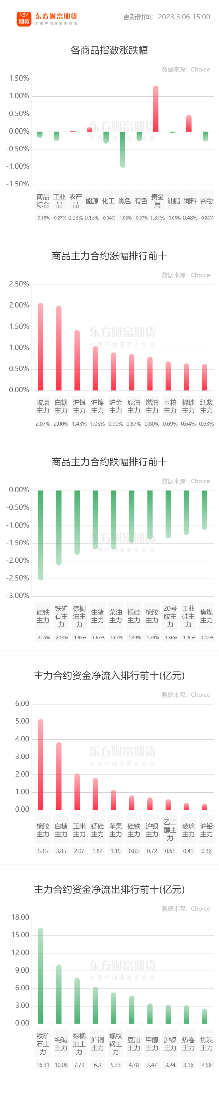 一、行情纵览 二、宏观要闻 国家发改委副主任李春临今日在“权威部门话开局”系列主题新闻发布会介绍,下一步,我们将全面贯彻落实党的二十大和中央经济工作会议精神,推动消费持续恢复和扩大,重点做好四个方面工作:一是多措并举推动消费平稳增长。制定出台关于恢复和扩大消费的政策文件,围绕稳定大宗消费、提升服务消费、拓展农村消费、营造放心消费环境等方面出台务实有效的政策举措,释放居民消费潜力。二是增强居民消费能力。消费能力来自于就业、来自于收入,所以一定要创新就业、收入分配和消费全链条良性循环促进机制,多渠道增加城乡居民收入,做好基本消费品保供稳价工作,使居民有稳定收入能消费,没有后顾之忧敢消费。三是改善消费环境。进一步完善促消费体制机制,研究制定关于营造放心消费环境的政策文件,健全标准质量管理体系,完善消费争议多元化解机制,在线消费纠纷调解机制,持续优化消费环境,让老百姓获得感强愿消费。四是培育消费新增长点。大力倡导绿色消费、新型消费,支持住房改善、新能源汽车、养老服务、教育医疗文化卫生体育等重点领域的消费,鼓励发展消费新业态新模式新场景,进一步激发消费市场活力。(中国网) 国家发改委副主任赵辰昕表示,统筹发展和安全,稳妥处置化解房地产、金融、地方政府债务等领域风险,切实加强粮食、能源资源、重要产业链供应链等领域安全能力建设。五是落实落细就业优先政策,强化基本公共服务,持续保障和改善民生。与此同时,我们将进一步加强经济监测预测预警和政策预研储备,不断丰富政策工具箱,坚持底线思维,做好应对复杂困难局面的各项工作准备,牢牢把握工作主动权,推动经济运行整体向好。(中国网) 三、品种资讯 【农副类】 粮食:国家发改委副主任赵辰昕6日在国新办新闻发布会上表示,一方面,全力抓好粮食生产。全面落实粮食安全党政同责、耕地保护党政同责,完善粮食主产区、主销区和产销平衡区支持政策,确保粮食播种面积稳定。启动实施新一轮千亿斤粮食产能提升行动,持续推进大豆和油料产能提升工程,深入实施种业振兴行动,加快农业关键核心技术攻关。另一方面,全力保障市场供应。不断提高收储调控能力,加强粮食总量平衡和市场调控,扎实做好粮食收购工作。加强粮食仓储物流设施建设,做好粮食库存销售安排。持续完善国家粮食应急保障体系。 生猪: 据国家发展改革委监测,2月27日—3月3日当周,全国平均猪粮比价为5.43∶1,连续三周处于5∶1—6∶1之间。根据《完善政府猪肉储备调节机制做好猪肉市场保供稳价工作预案》有关规定,由过度下跌一级预警区间回升至过度下跌二级预警区间。(财联社) 据国家发改委数据,截至3月1日,全国生猪出场价格为15.85元/公斤,比2月22日上涨2.59%;主要批发市场玉米价格为2.92元/公斤,较2月22日持平;猪粮比价为5.43,比2月22日上涨2.65%。(国家发改委) 傲农生物3月6日在投资者互动平台表示,1、公司2月肥猪出栏均重为112公斤左右,公司基本上按照“均衡出栏”策略,出栏体重的范围为110-120公斤(年度内各月份略有差异)。2、公司2月出栏量与公司目前养殖体量是相匹配的。公司月出栏量自2022年9月起基本上均在45-51万头之间,存栏量自2022年11月起均维持在240万头以上。公司2月份出栏50万头左右,主要是公司当前养殖规模决定的。另外,由于1月份是春节,也存在部分出栏延迟到2月的因素,两月平均来看,出栏规模与前几月并无差异。3、公司持续推进育肥配套工作,2月份出栏肥猪数量比去年同期增长120%左右,后续公司将继续加大育肥配套比重。(每日经济新闻) 饲料:新希望近日在机构调研时表示,今年饲料业务总体上量利均会好于去年。从需求端看,下游养殖环节自去年下半年开始结束连续五个季度的亏损开始盈利,养猪户资金相对会充裕一些,且大多数养殖户看好下半年行情,所以在饲料上会更愿意投入一些资金。从供给端看,饲料原材料价格达到高点后处于下降的通道中,去年发生的国际地缘冲突带来的影响已经充分消化,今年全年的原料价格预计整体会边际向好,至少相比去年不会边际变差。(证券时报·e公司) 棉花: 据Mysteel调研显示,截止至3月3日,进口棉花主要港口库存周环比增6.9%,总库存23.45万吨其中,山东地区青岛、济南港口及周边仓库进口棉库存约18.5万吨,周环比增8.2%,同比库存低26.3%;江苏地区张家港港口及周边仓库进口棉库存约1.8万吨,其他港口库存约3.15万吨。(Mysteel) 据Mysteel调研显示,全国商业库存环比小增,棉市供应压力仍存。截止3月3日,棉花商业总库存424.79万吨,环比上周增加2.34万吨(增幅0.55%)。 其中,新疆地区商品棉365.84万吨,周环比增加0.12万吨(增幅0.03%);内地地区国产商品棉35.5万吨,周环比增加0.7万吨(增幅2.01%)。(Mysteel) 橡胶:截至2023年3月5日,青岛地区天胶保税和一般贸易合计库存量59.49万吨,较上期增加1.62万吨,环比增幅2.81%。保税区库存环比增加2.89%至10.73万吨,一般贸易库存环比增加2.79%至48.76万吨。(隆众资讯) 【能化类】 原油: 据外媒3月5日消息,沙特上调4月份销往亚欧两地的大部分原油价格,暗示其认为亚洲和欧洲的石油需求将会上升,同时将销往美国的原油价格维持不变。尽管原油期货价格今年略有下跌,但许多能源交易员和公司高管预计价格将继续攀升。随着疫情限制放松以